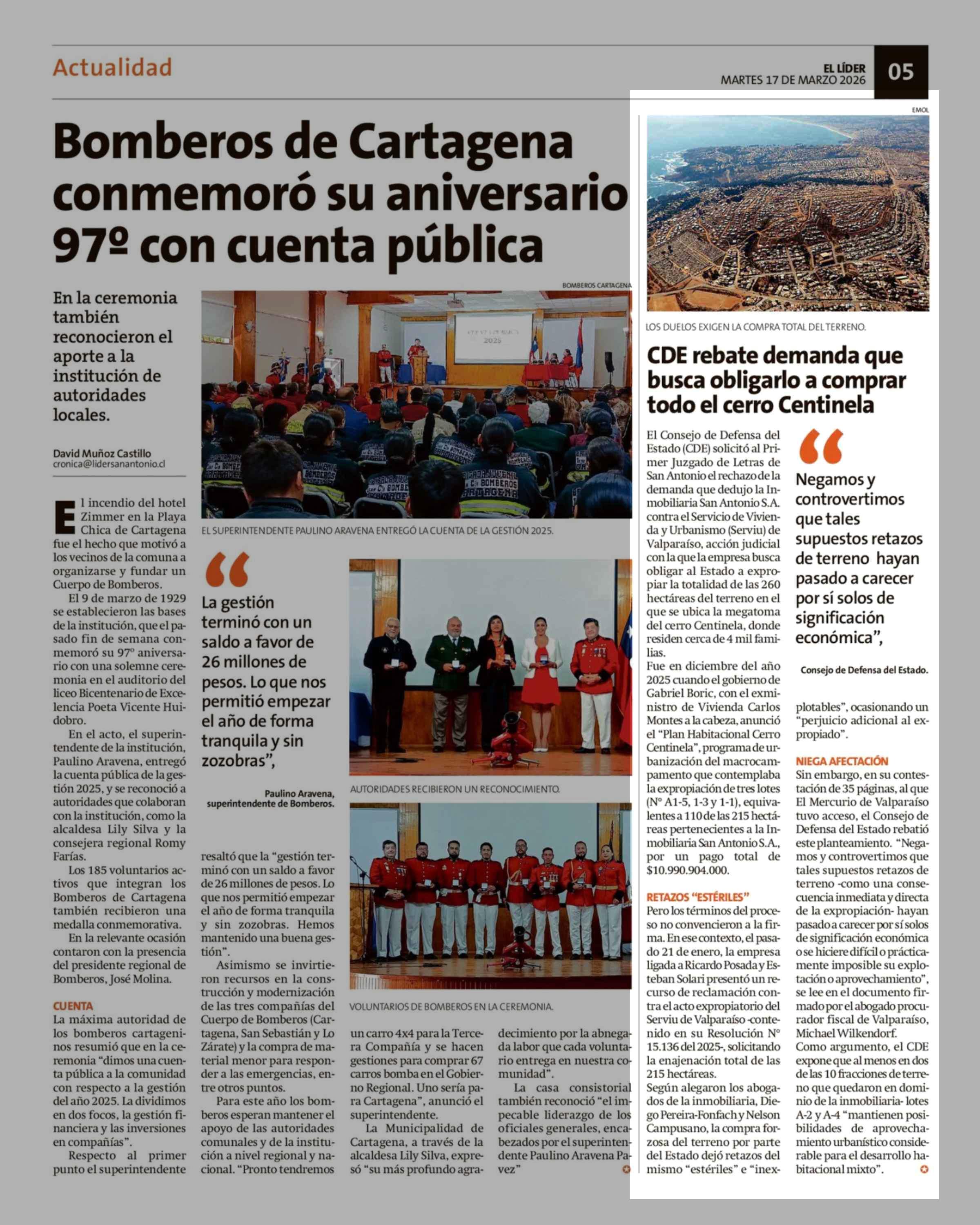 CDE rebate demanda que busca obligarlo a comprar todo el cerro Centinela 17-03-2026 El Líder |