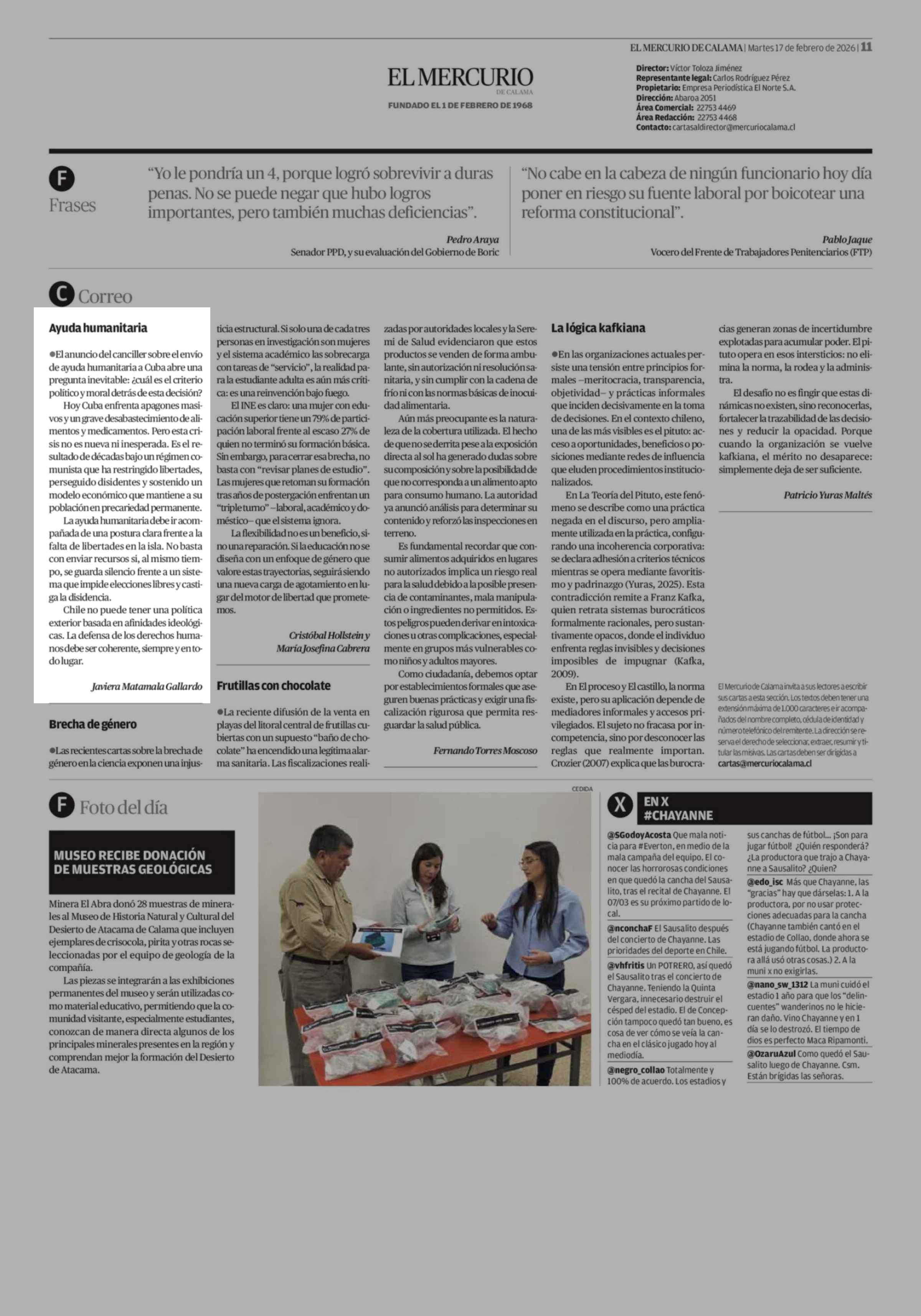 Cartas: Ayuda humanitaria 17-02-2026 El Mercurio de Calama |