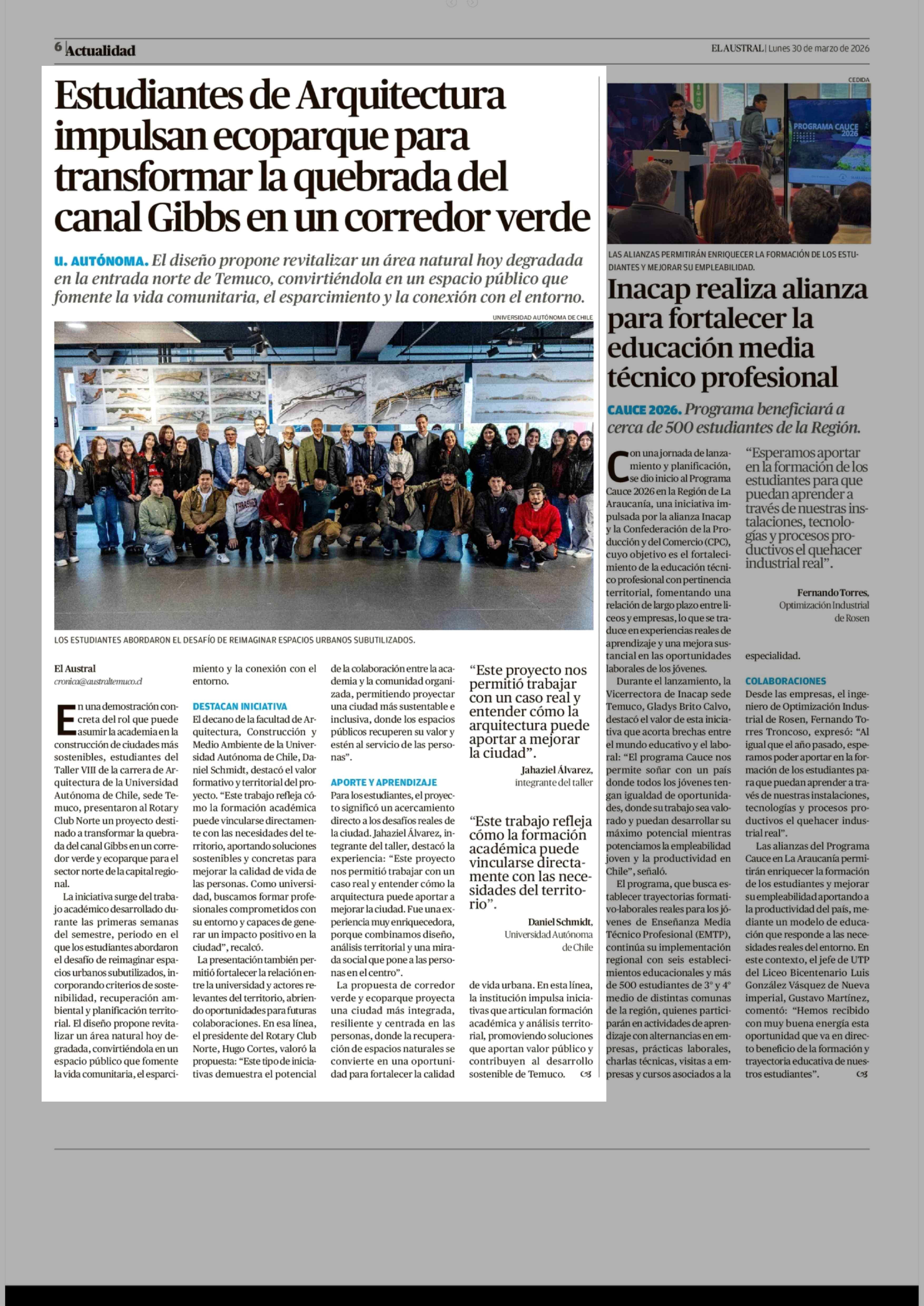 Estudiantes de Arquitectura impulsan ecoparque para transformar la quebrada del canal Gibbs en un corredor verde 30-03-2026 El Austral de la Araucanía |