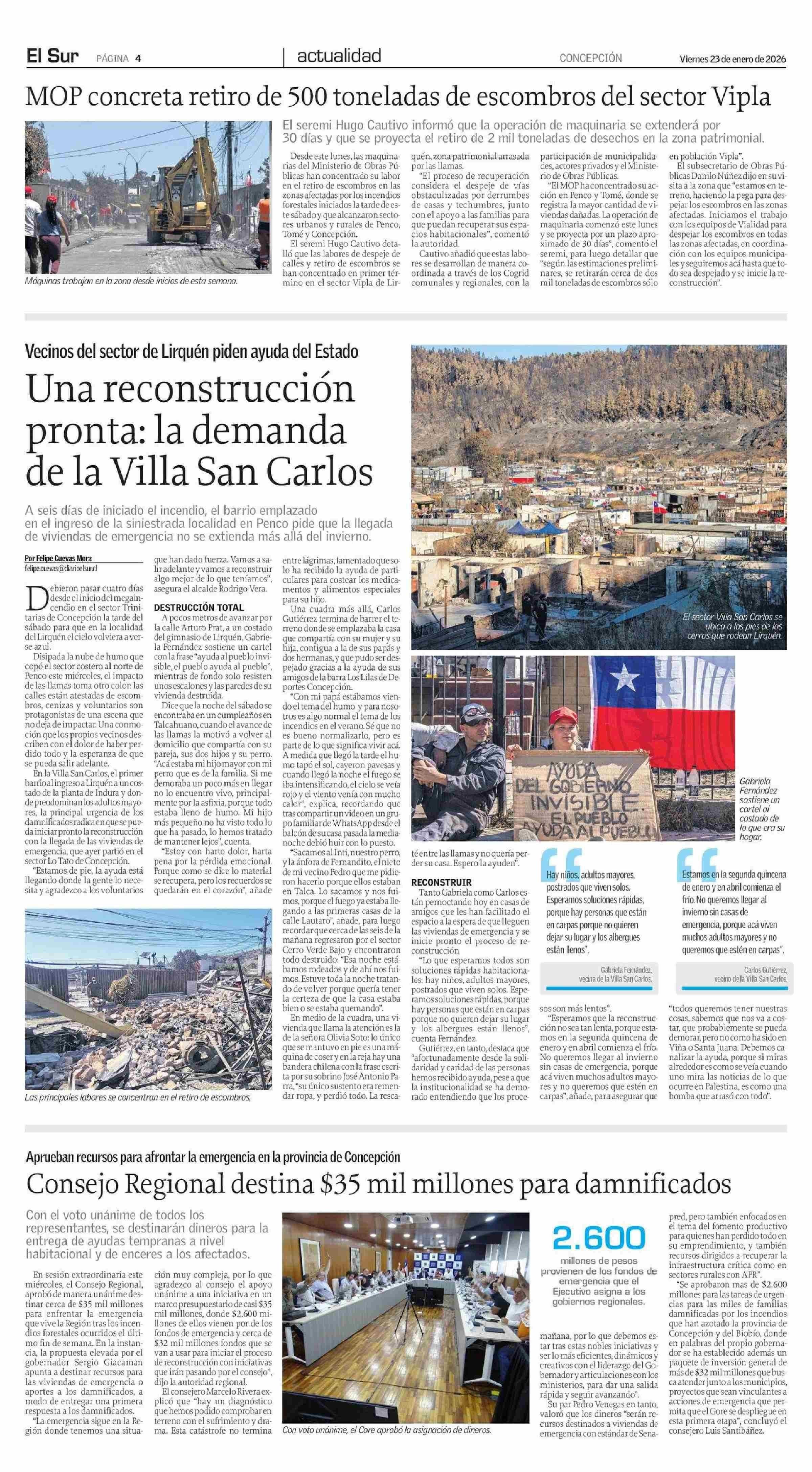 MOP concreta retiro de 500 toneladas de escombros del sector Vipla 23-01-2026 El Sur |