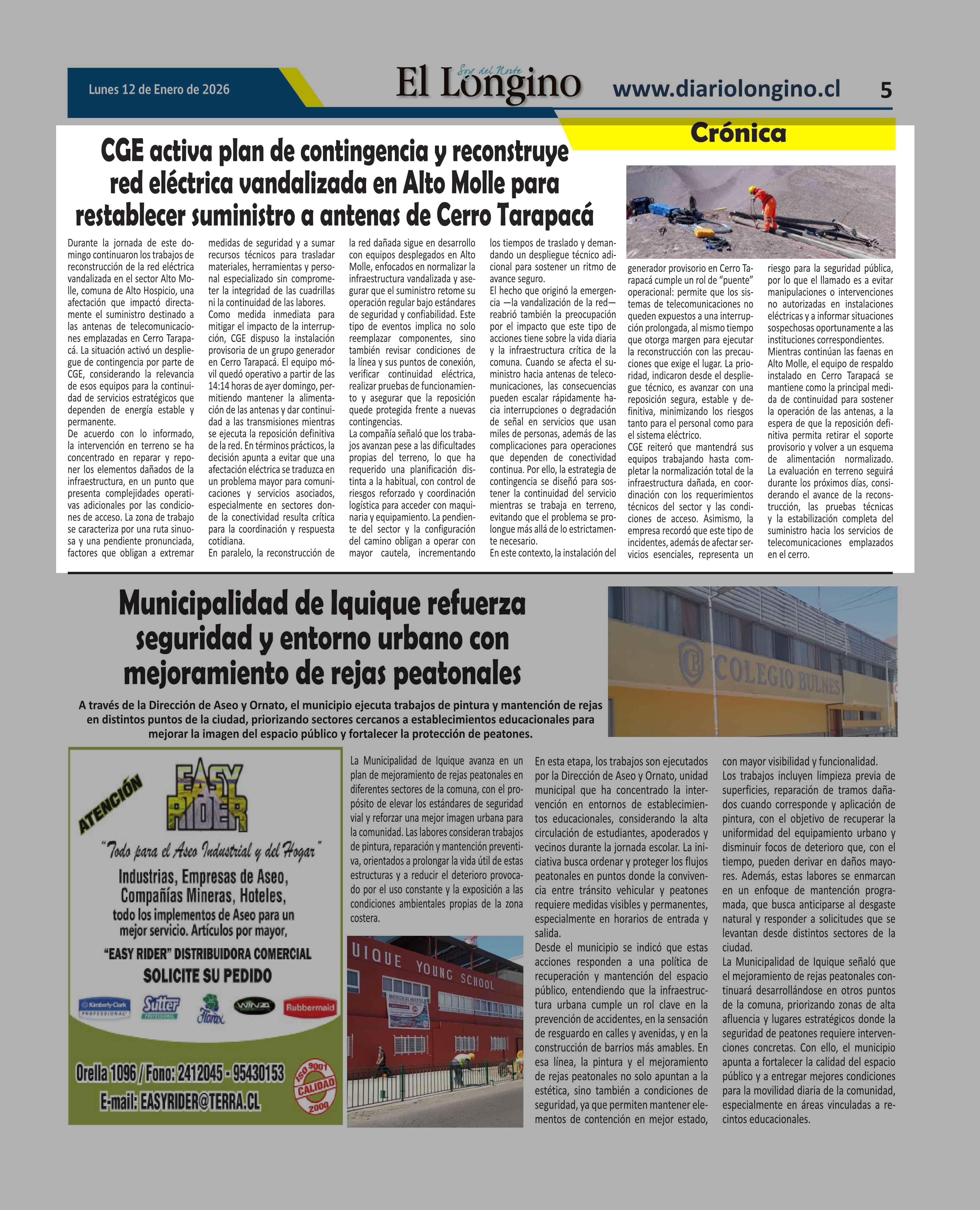 | Título: | CGE activa plan de contingencia y reconstruye red eléctrica vandalizada en Alto Molle para restablecer suministro a antenas de Cerro Tarapacá |