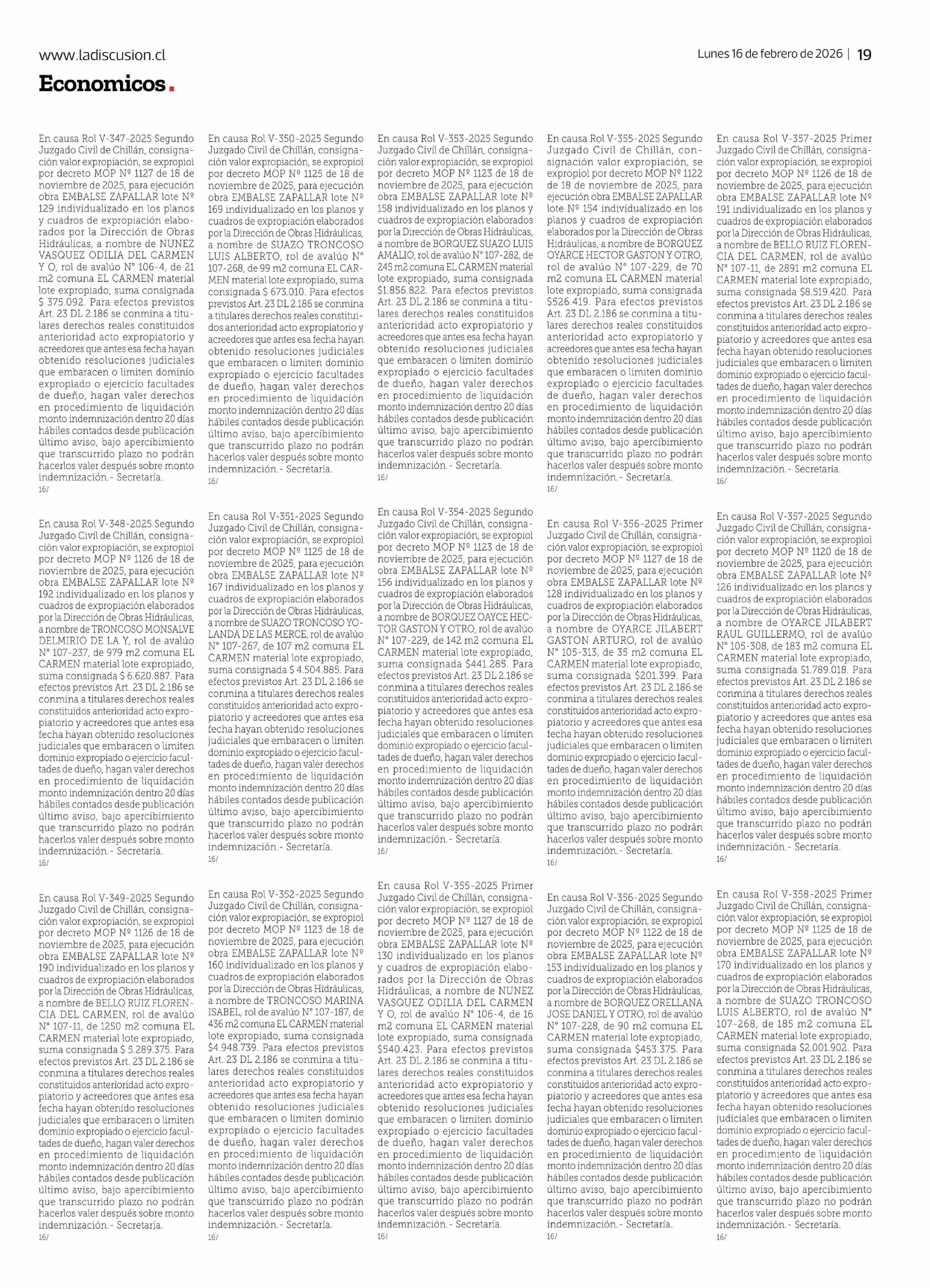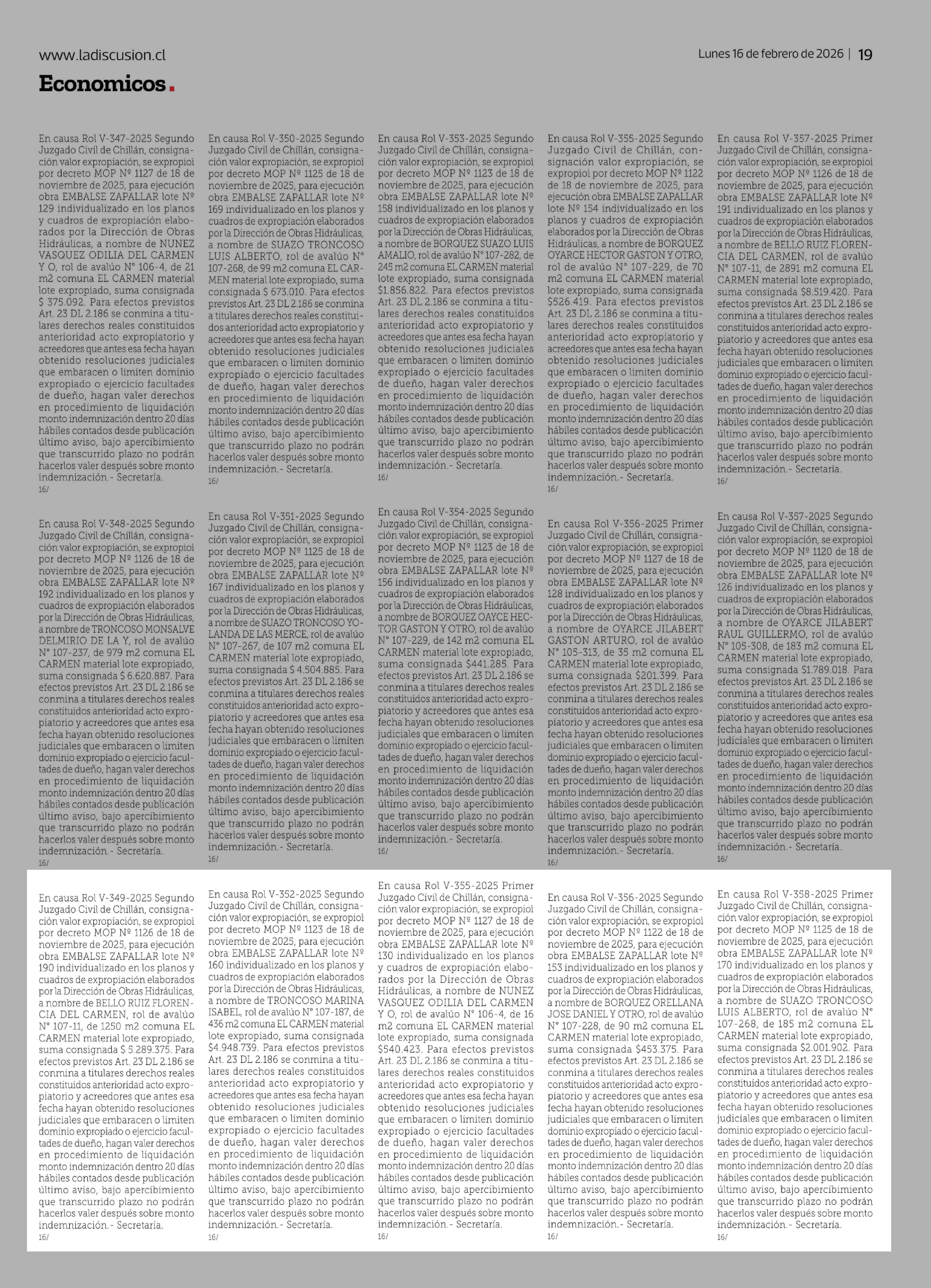Título: En causa Rol V-335-2025 Segundo Juzgado Civil de Chillán, consignación valor expropiación, se expropioì por decreto MOP Nº 1148 de 21 de noviembre de 2025, para ejecución obra MEJORAMIENTO DEL CANAL DE LA LUZ EN CHILLAN SECTOR: ESTERO LAS TOSCAS lote Nº 4 individualizado en los planos y cuadros de e