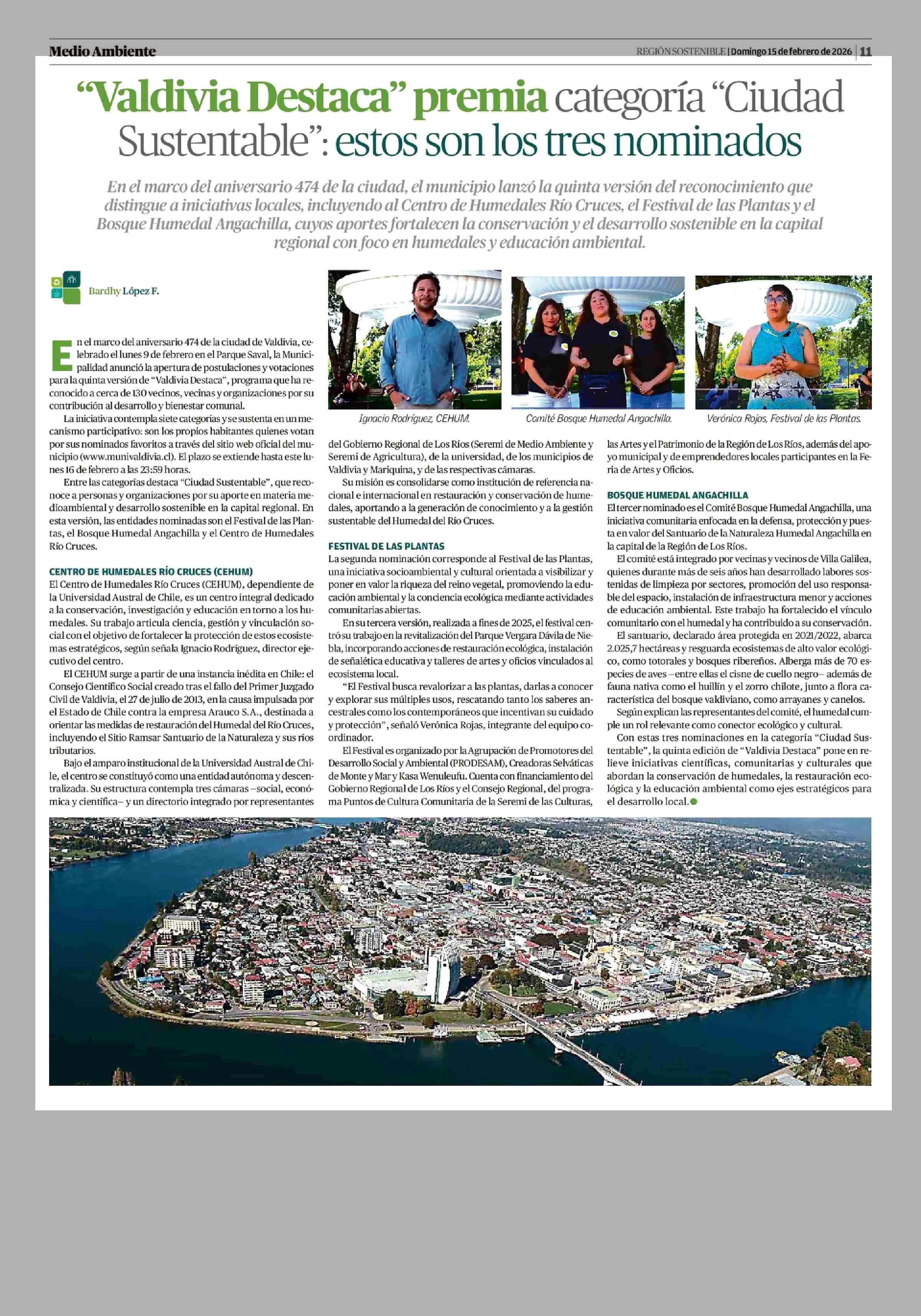 “Valdivia Destaca” premia categoría “Ciudad Sustentable”: estos son los tres nominados 15-02-2026 Diario Austral Región de Los Ríos |