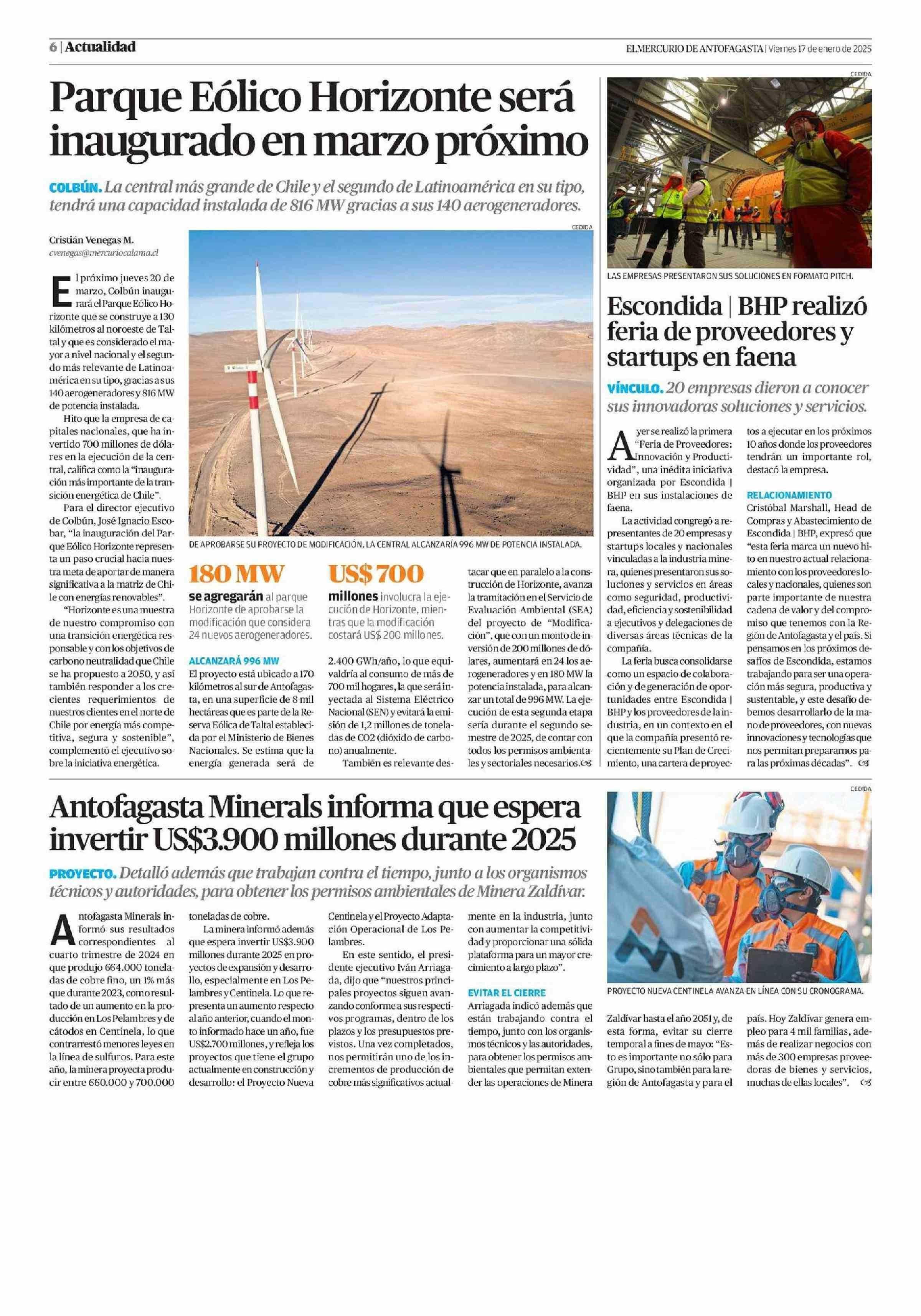Parque Eólico Horizonte será inaugurado en marzo próximo 17-01-2025 El Mercurio de Antofagasta |