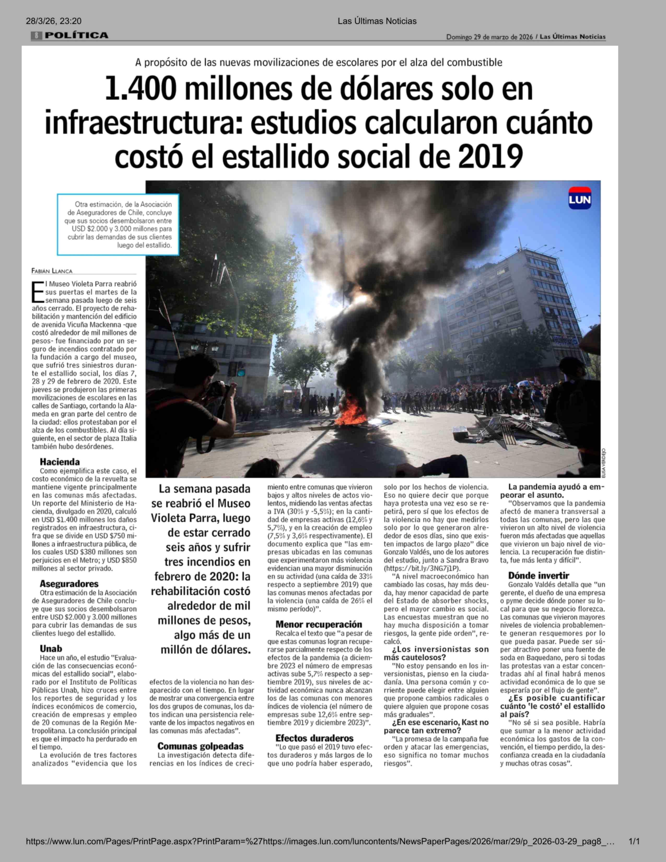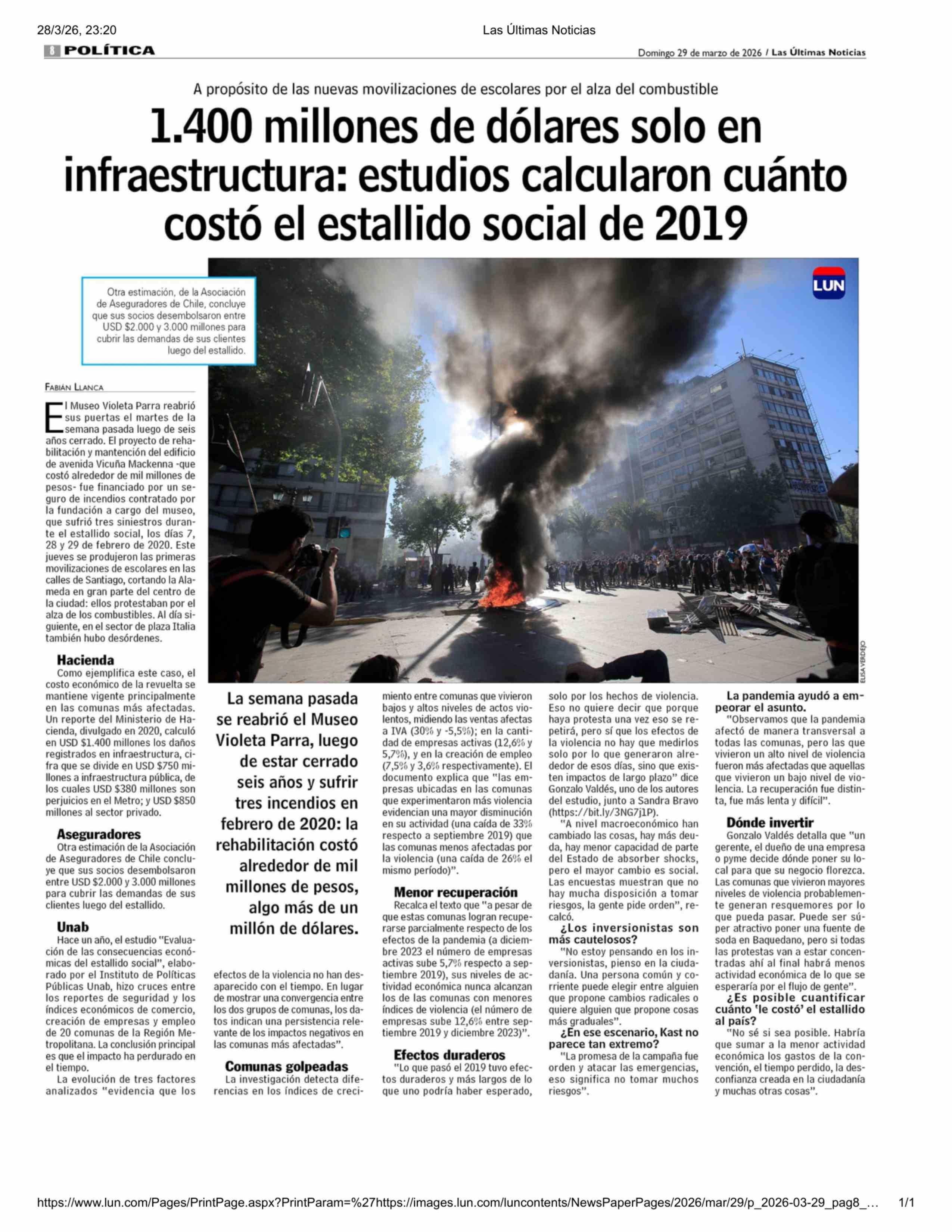 1.400 Millones de dólares solo en infraestructura: estudios calcularon cuanto costó el estallido social de 2019 29-03-2026 Las Últimas Noticias |