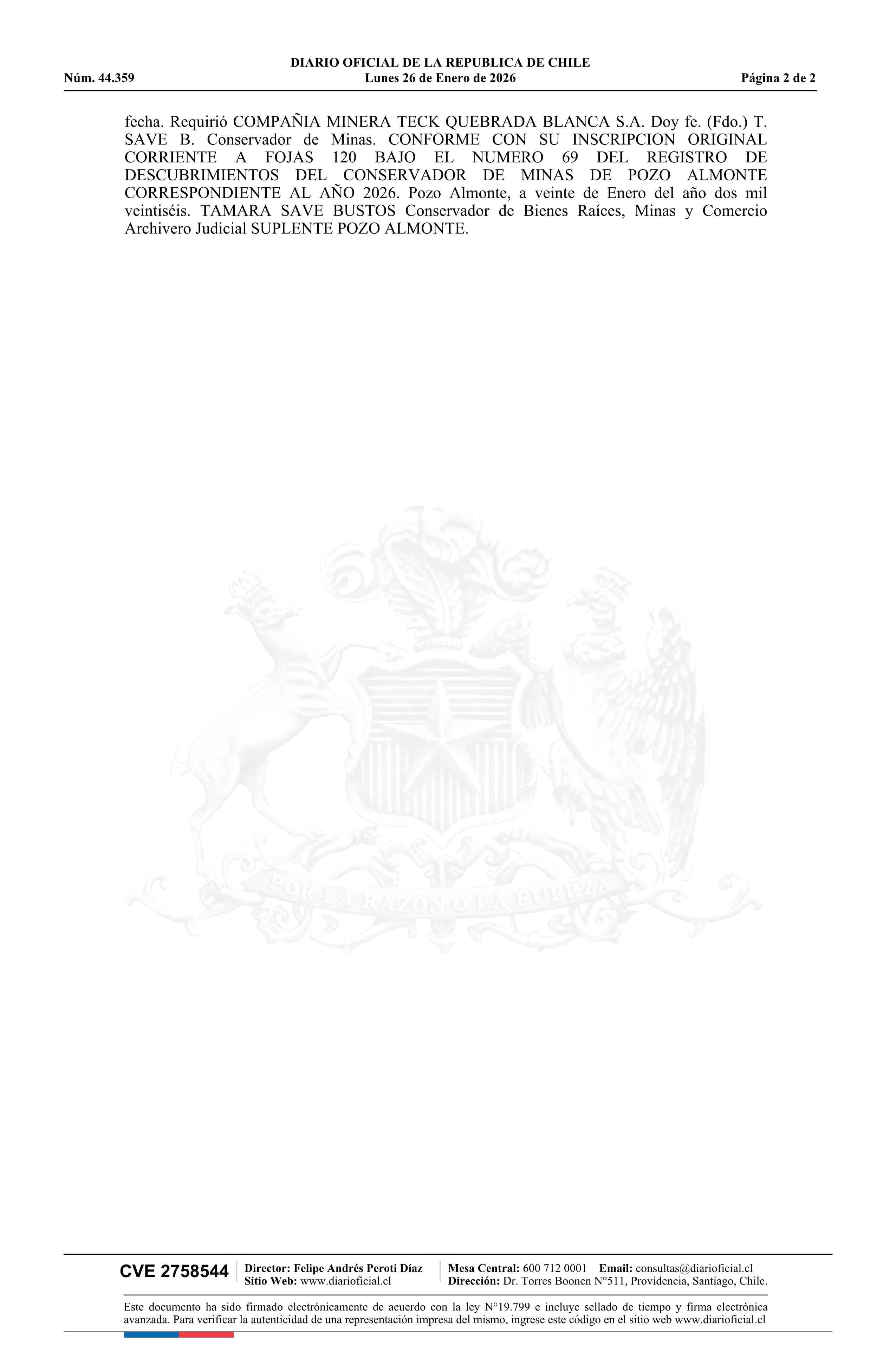 NICOLAS 1 / Compañía Minera Teck Quebrada Blanca S.A. 26-01-2026 DIARIO OFICIAL CHILE - BOLETÍN OFICIAL DE MINERÍA |