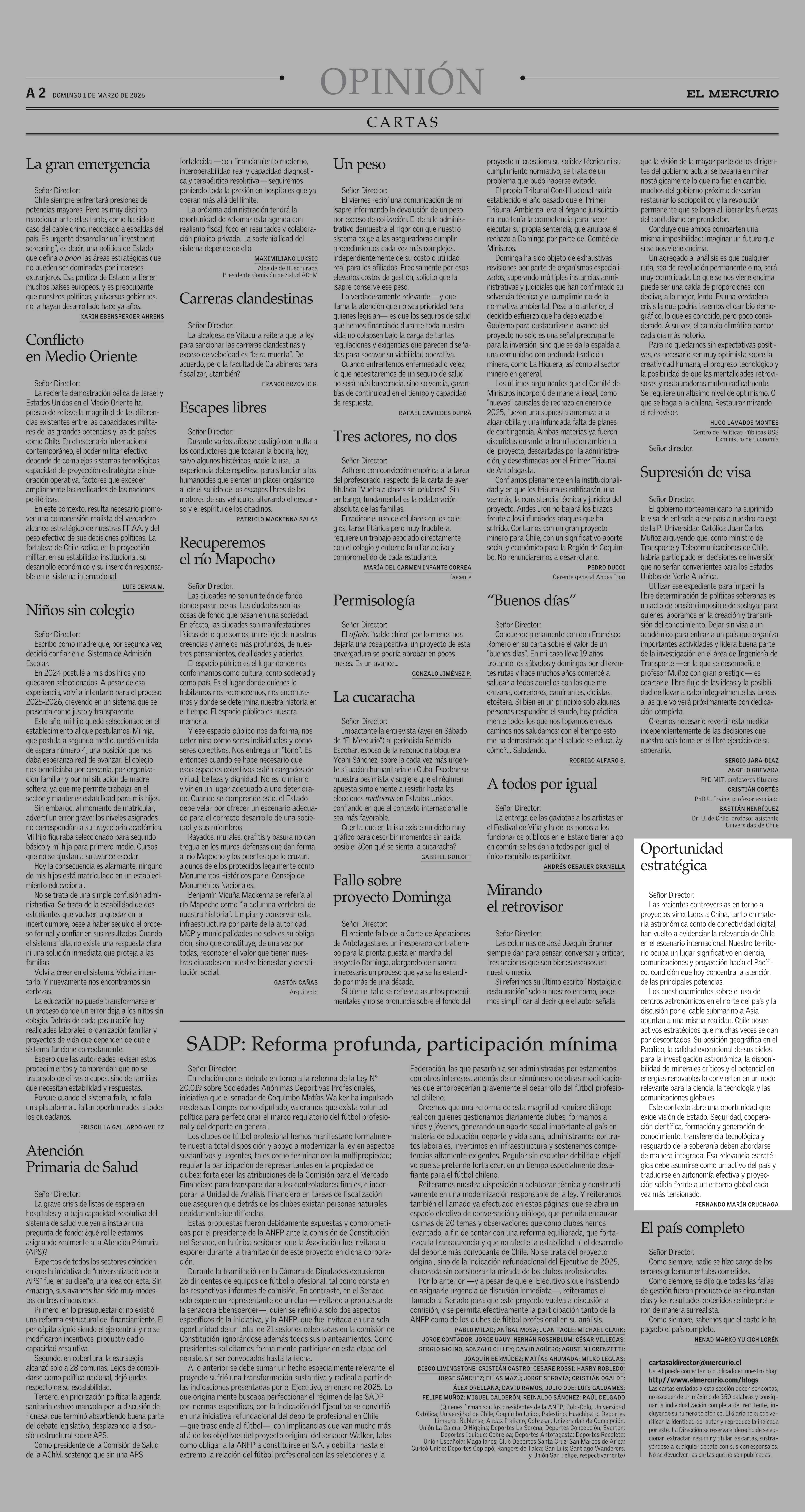 CARTAS: Oportunidad estratégica 01-03-2026 El Mercurio |