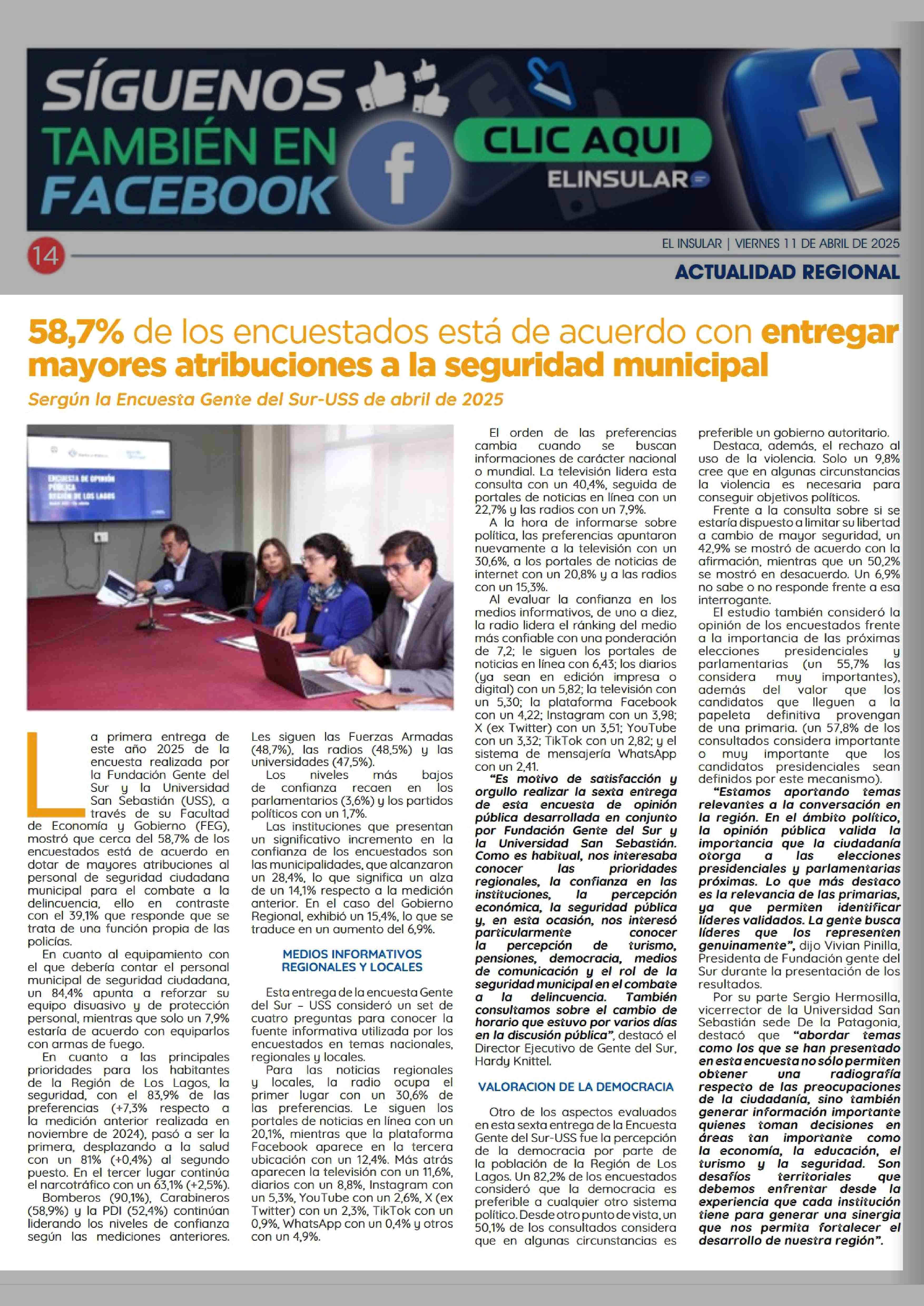 58,7% de los encuestados está de acuerdo con entregar mayores atribuciones a la seguridad municipal 11-04-2025 El Insular |