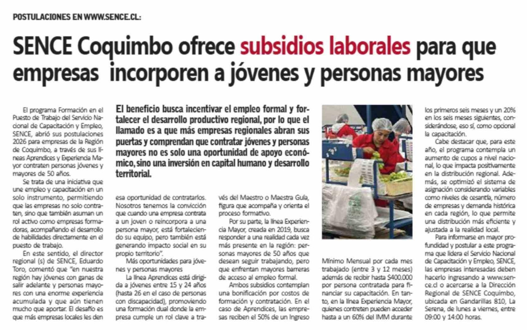 | Título: | SENCE Coquimbo ofrece subsidios laborales para que empresas incorporen a jóvenes y personas mayores |