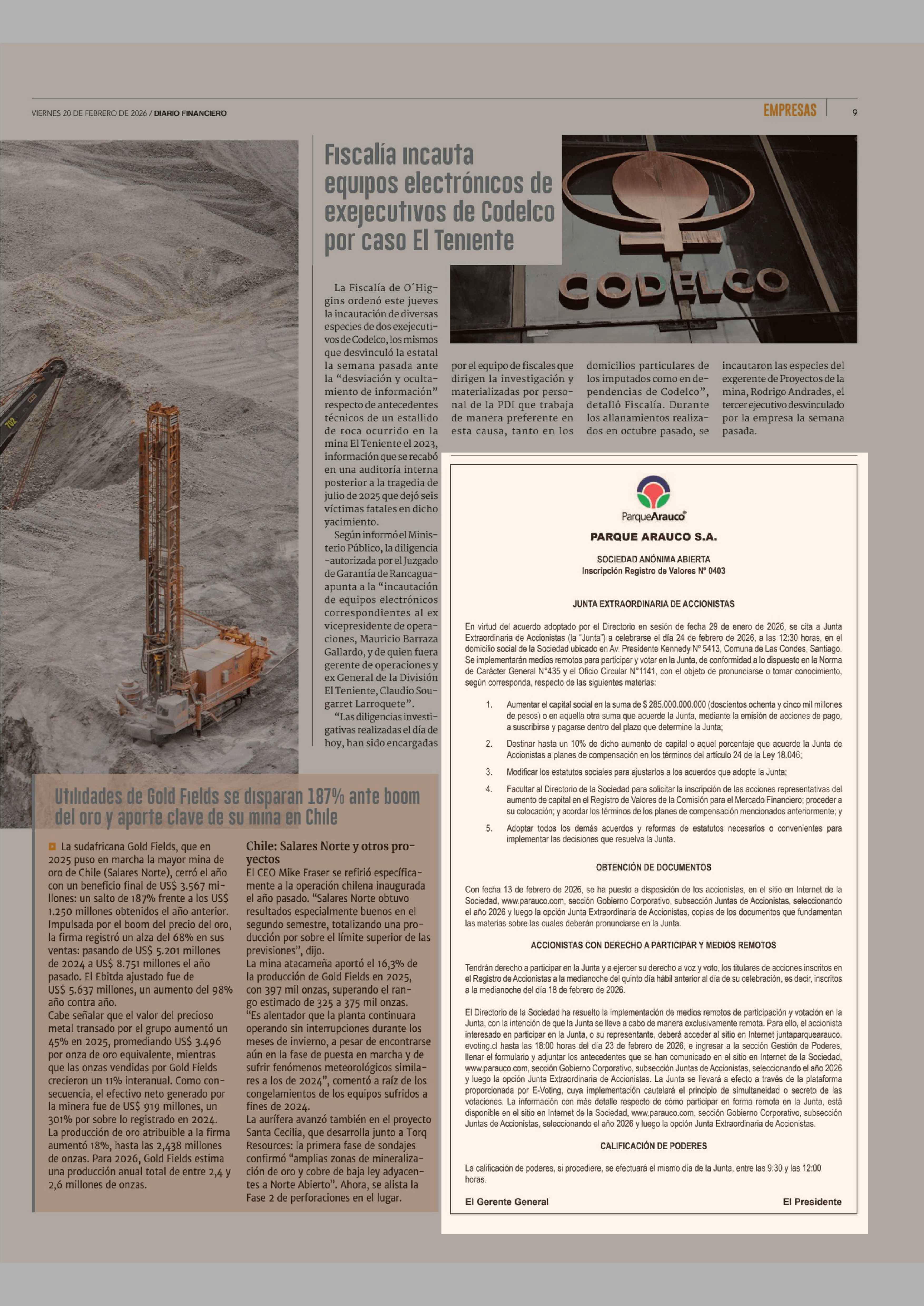 Extractos: PARQUE ARAUCO S.A. 20-02-2026 Diario Financiero |