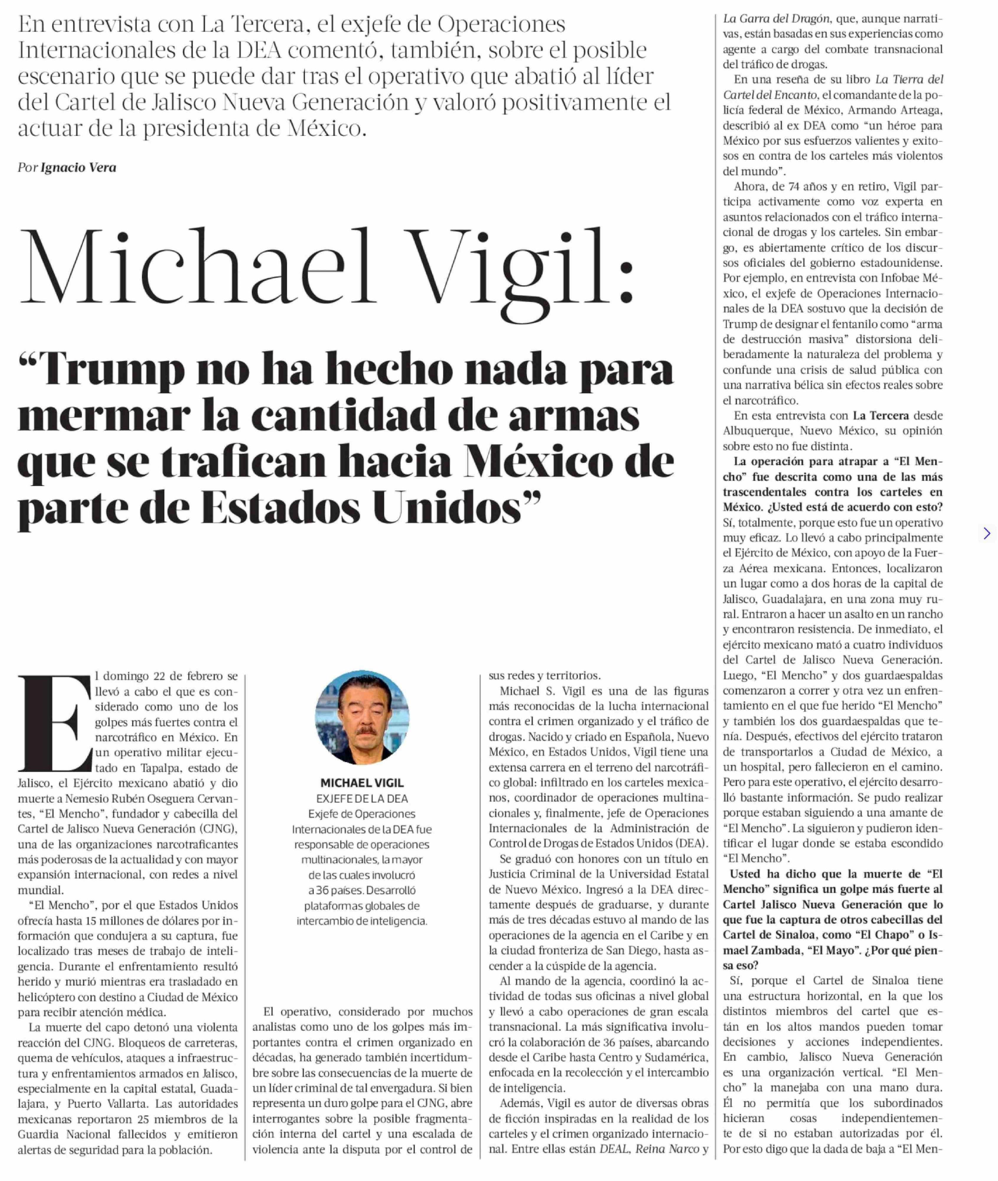 Título: Michael Vigil: "Trump no ha hecho nada para mermar la cantidad de armas que se trafican hacia México de parte de Estados Unidos"