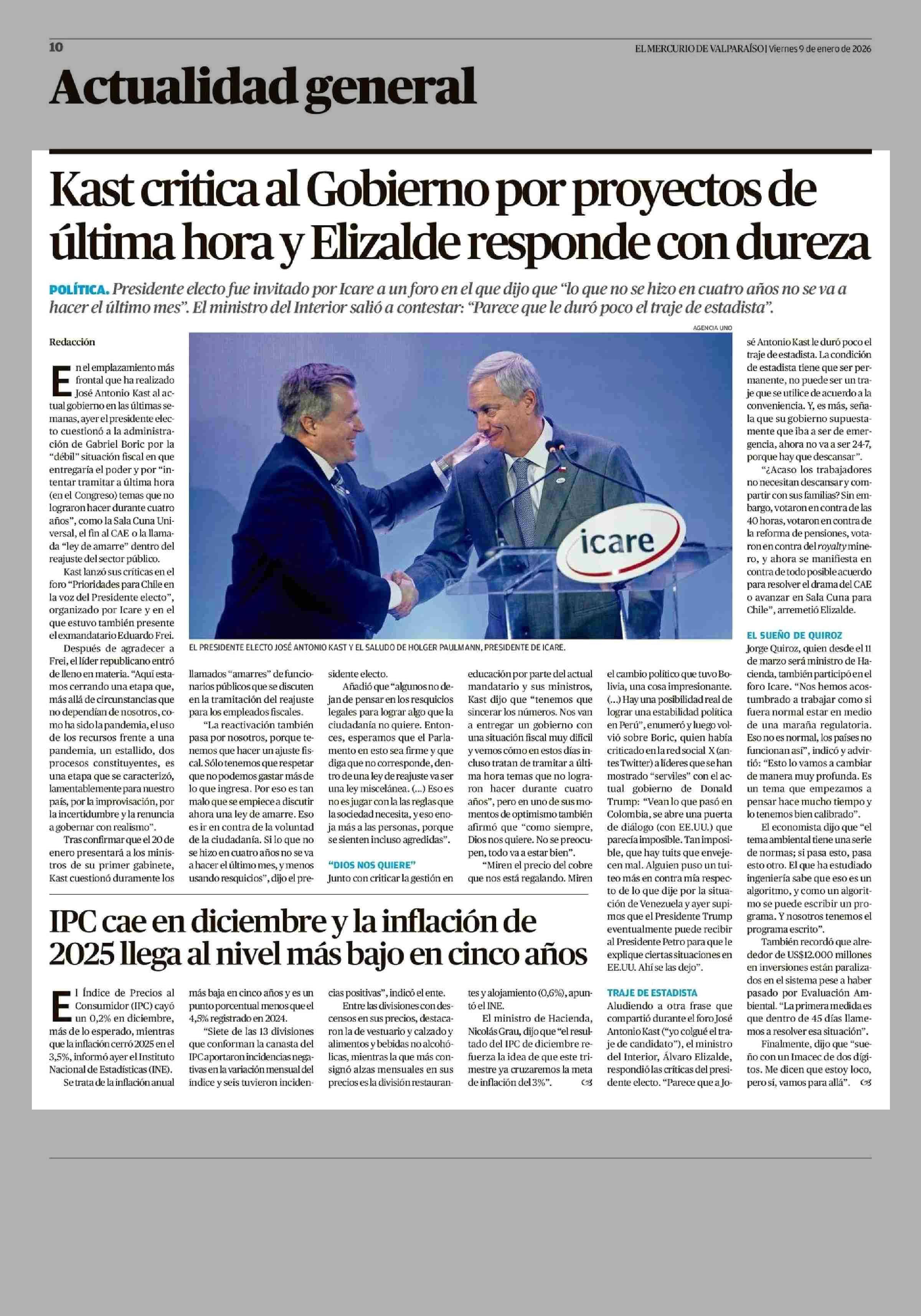 Kast critica al Gobierno por proyectos de última hora y Elizalde responde con dureza 09-01-2026 El Mercurio de Valparaíso |