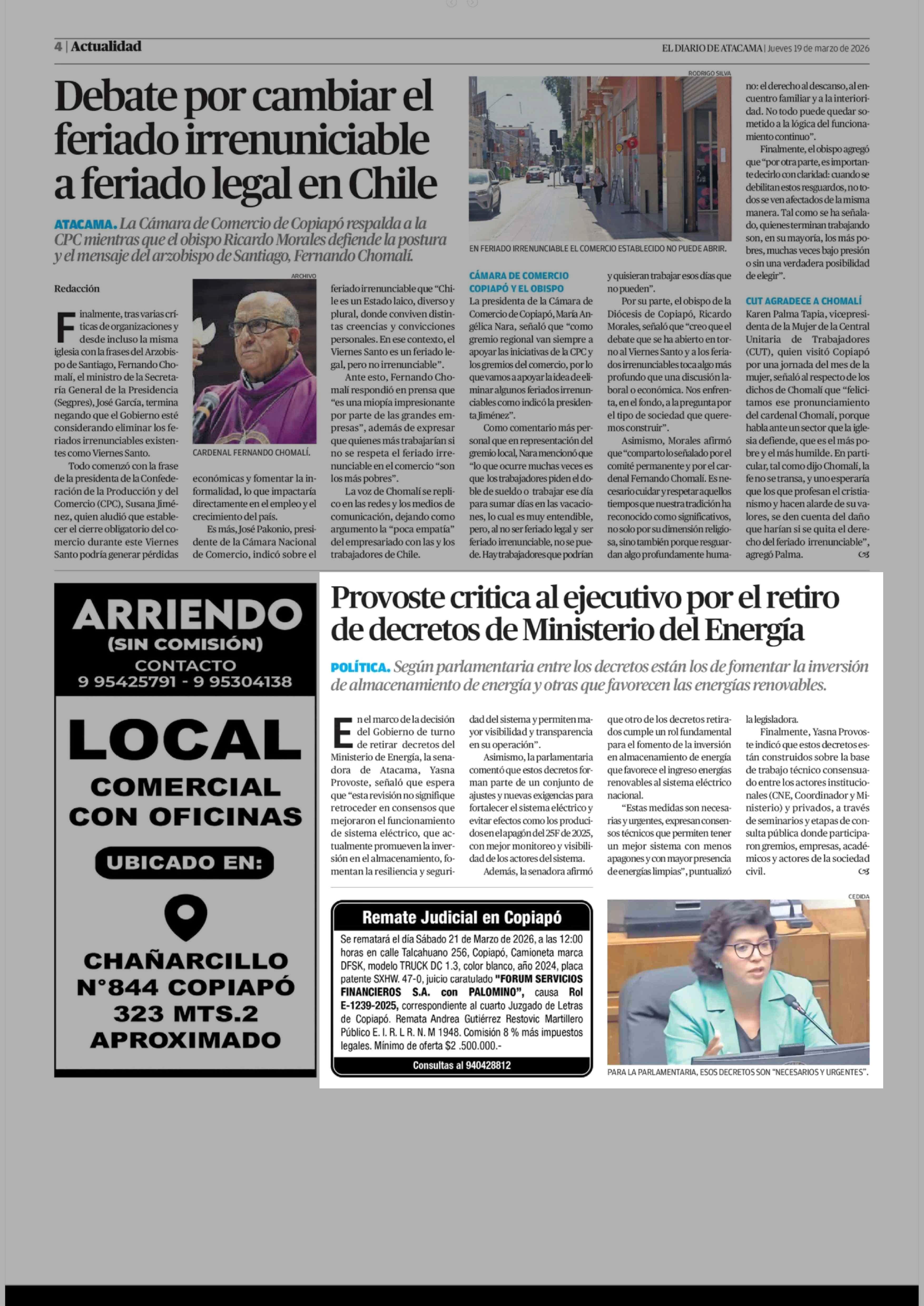 Provoste critica al ejecutivo por el retiro de decretos de Ministerio del Energía 19-03-2026 El Diario de Atacama |
