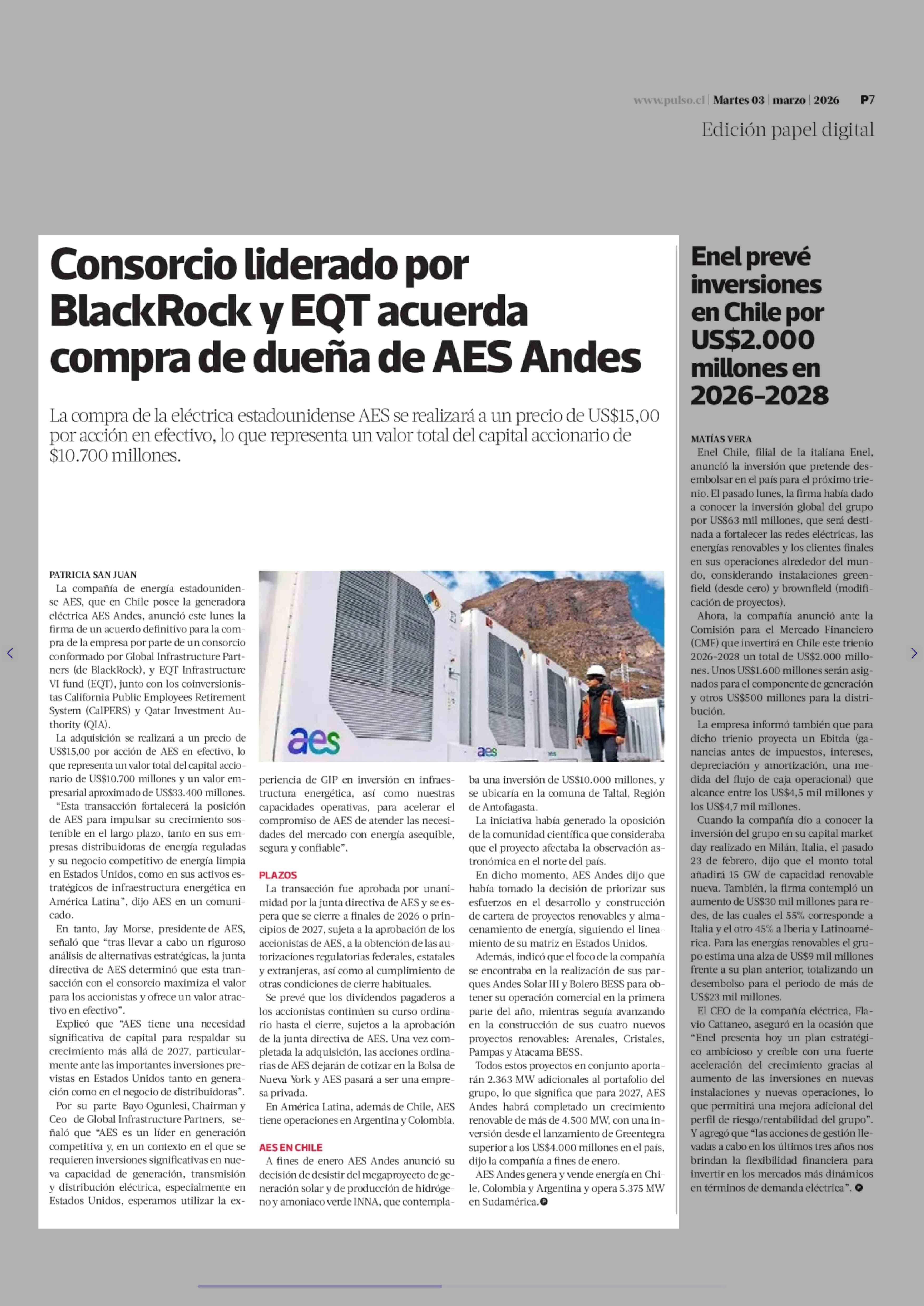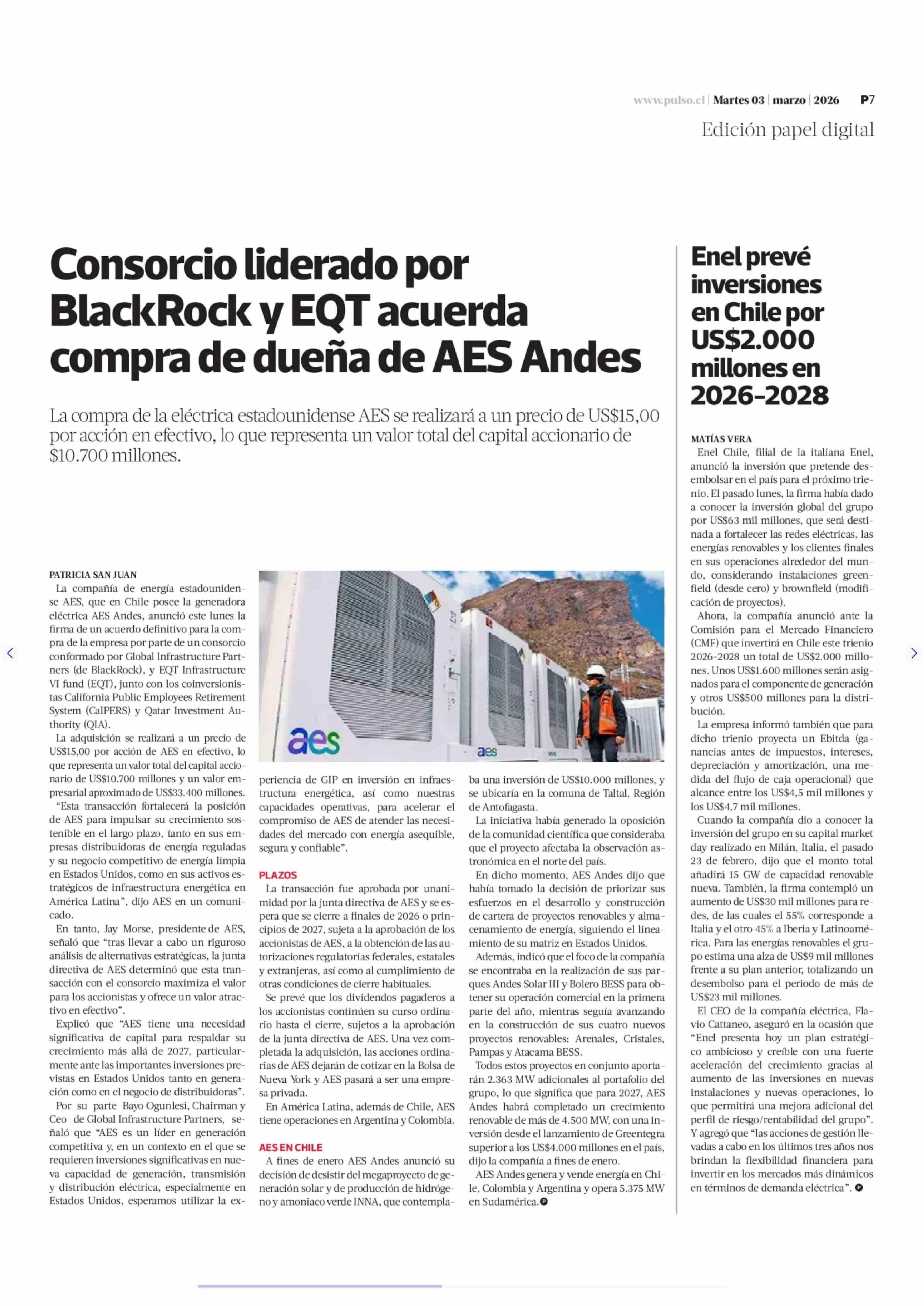 Título: Consorcio liderado por BlackRock y EQT acuerda compra de dueña de AES Andes