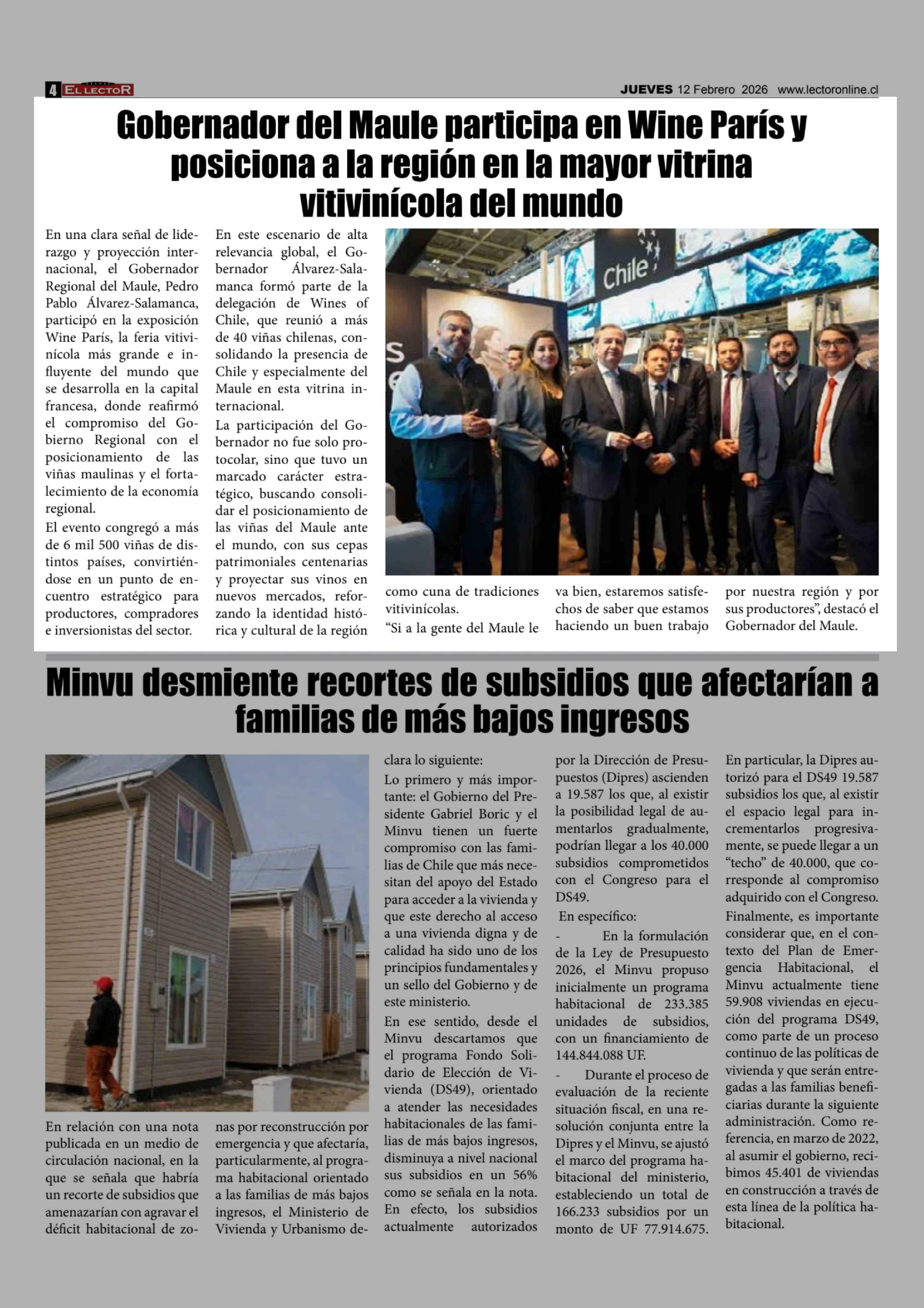 Gobernador del Maule participa en Wine París y posiciona a la región en la mayor vitrina vitivinícola del mundo 12-02-2026 El Lector |