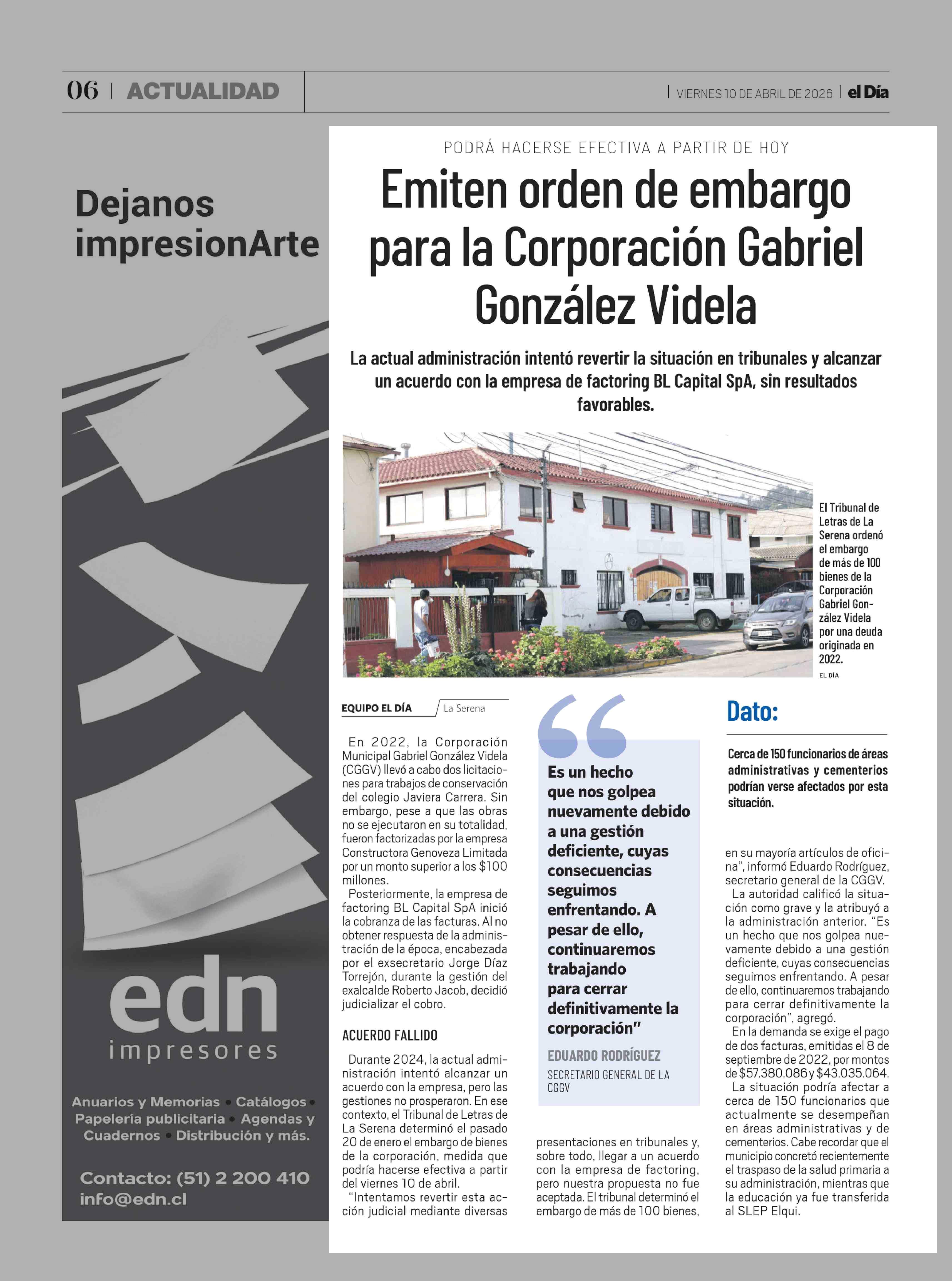 Emiten orden de embargo para la Corporación Gabriel González Videla 10-04-2026 El Día |