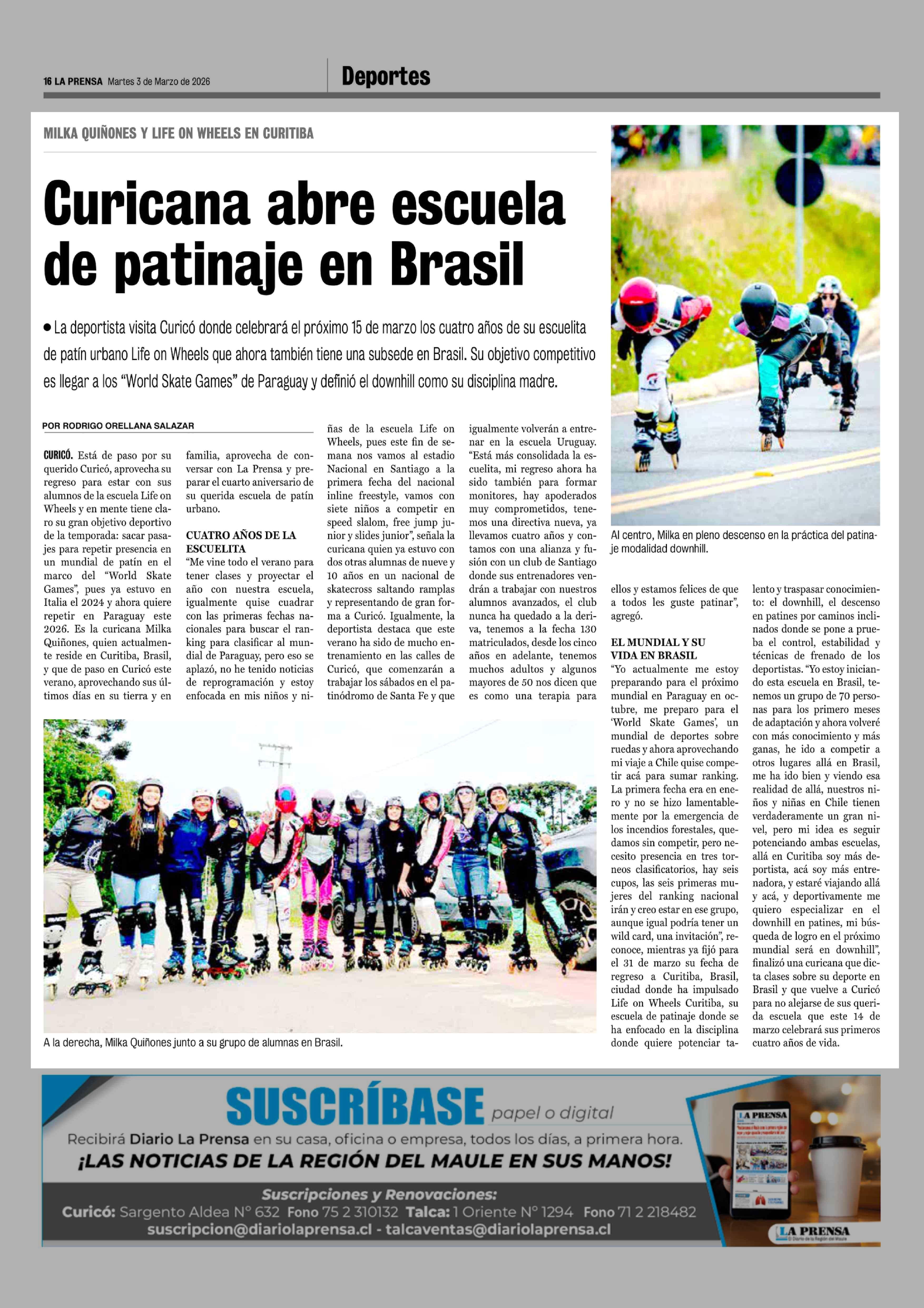 Curicana abre escuela de patinaje en Brasil 03-03-2026 La Prensa de Curicó |