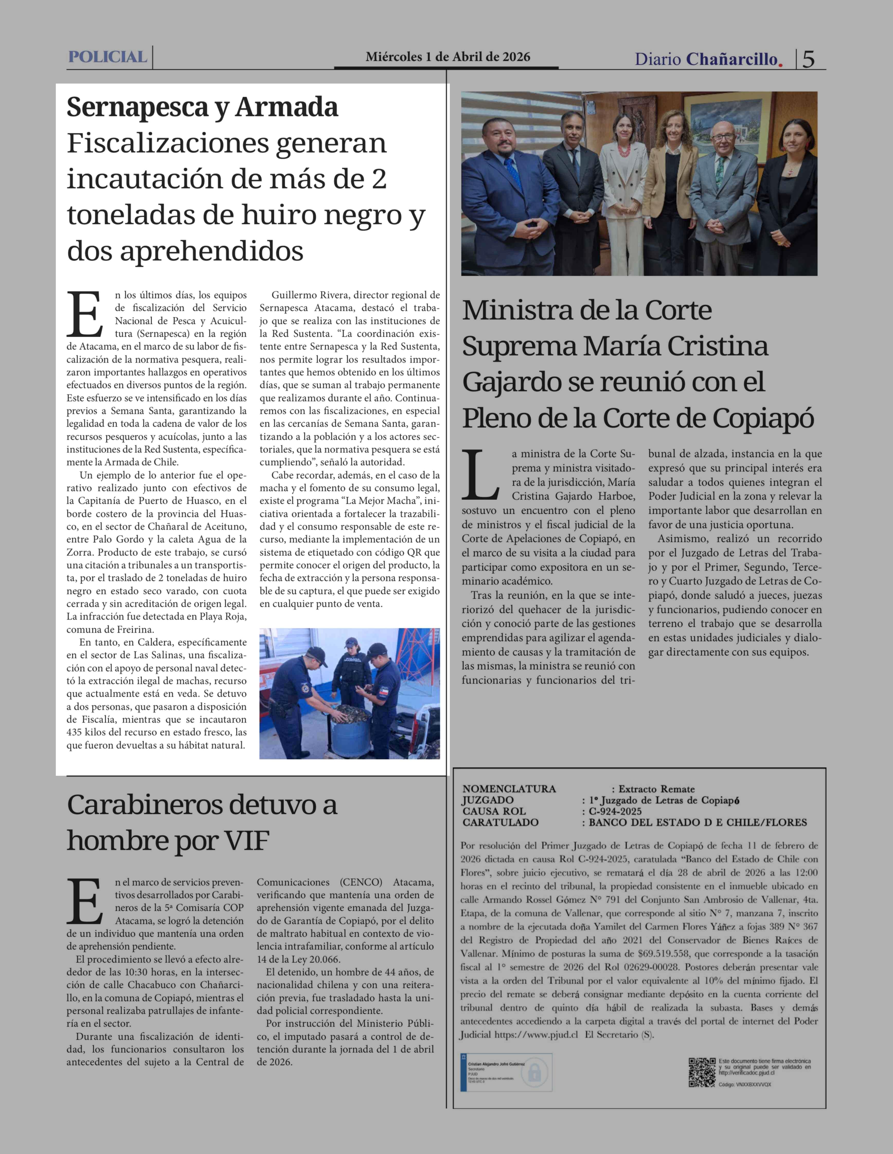 Sernapesca y Armada Fiscalizaciones generan incautación de más de 2 toneladas de huiro negro y dos aprehendidos 01-04-2026 Diario Chañarcillo |