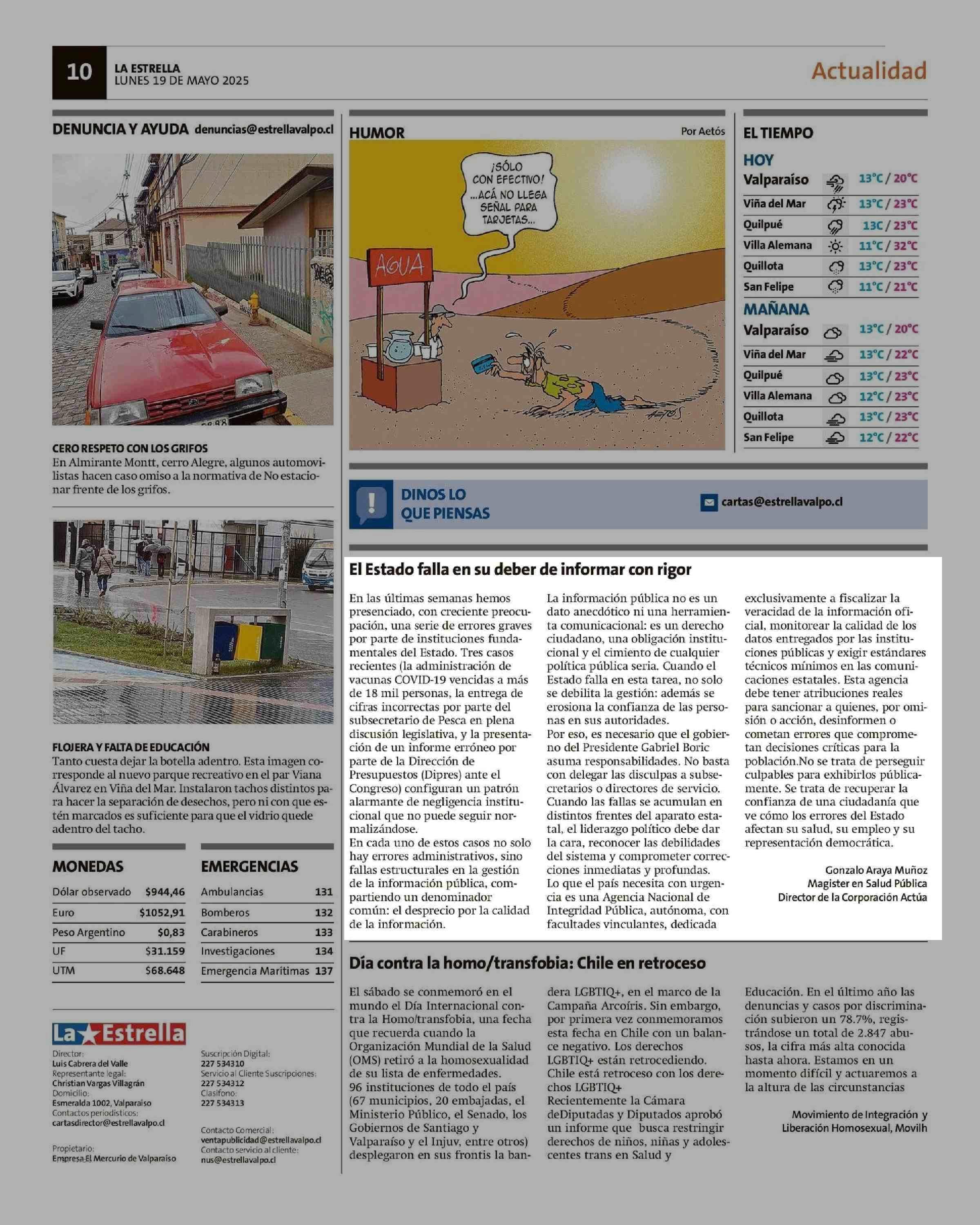 CARTAS: El Estado falla en su deber de informar con rigor 19-05-2025 La Estrella de Valparaíso |