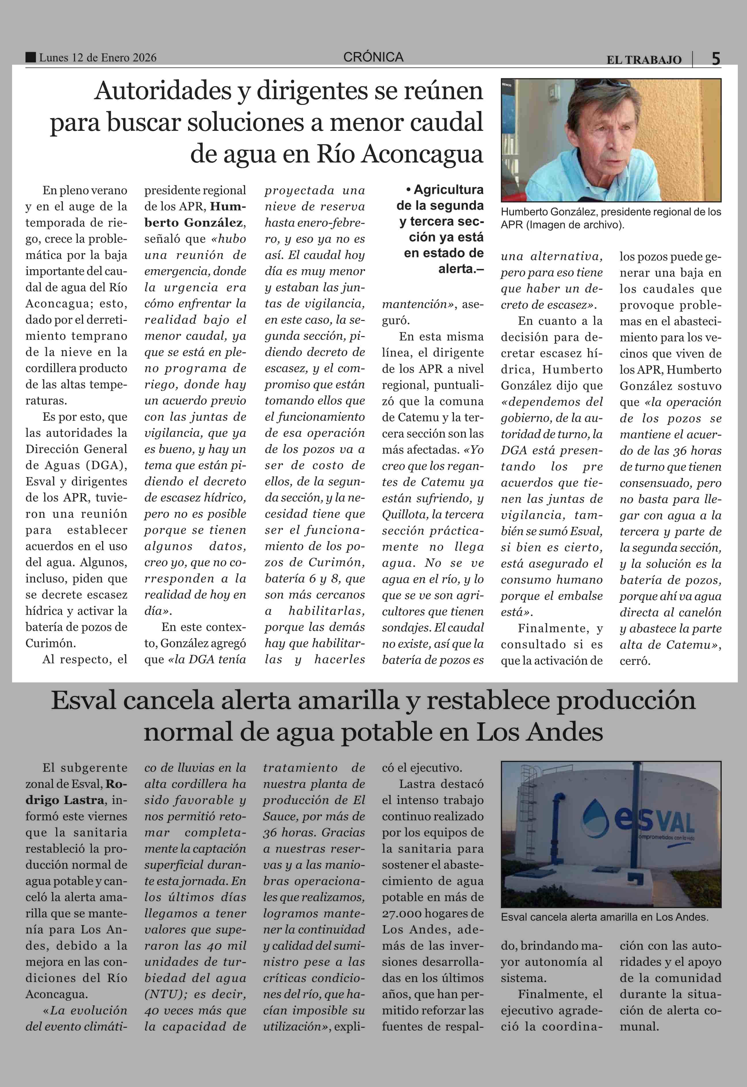 Autoridades y dirigentes se reúnen para buscar soluciones a menor caudal de agua en Río Aconcagua 12-01-2026 El Trabajo |