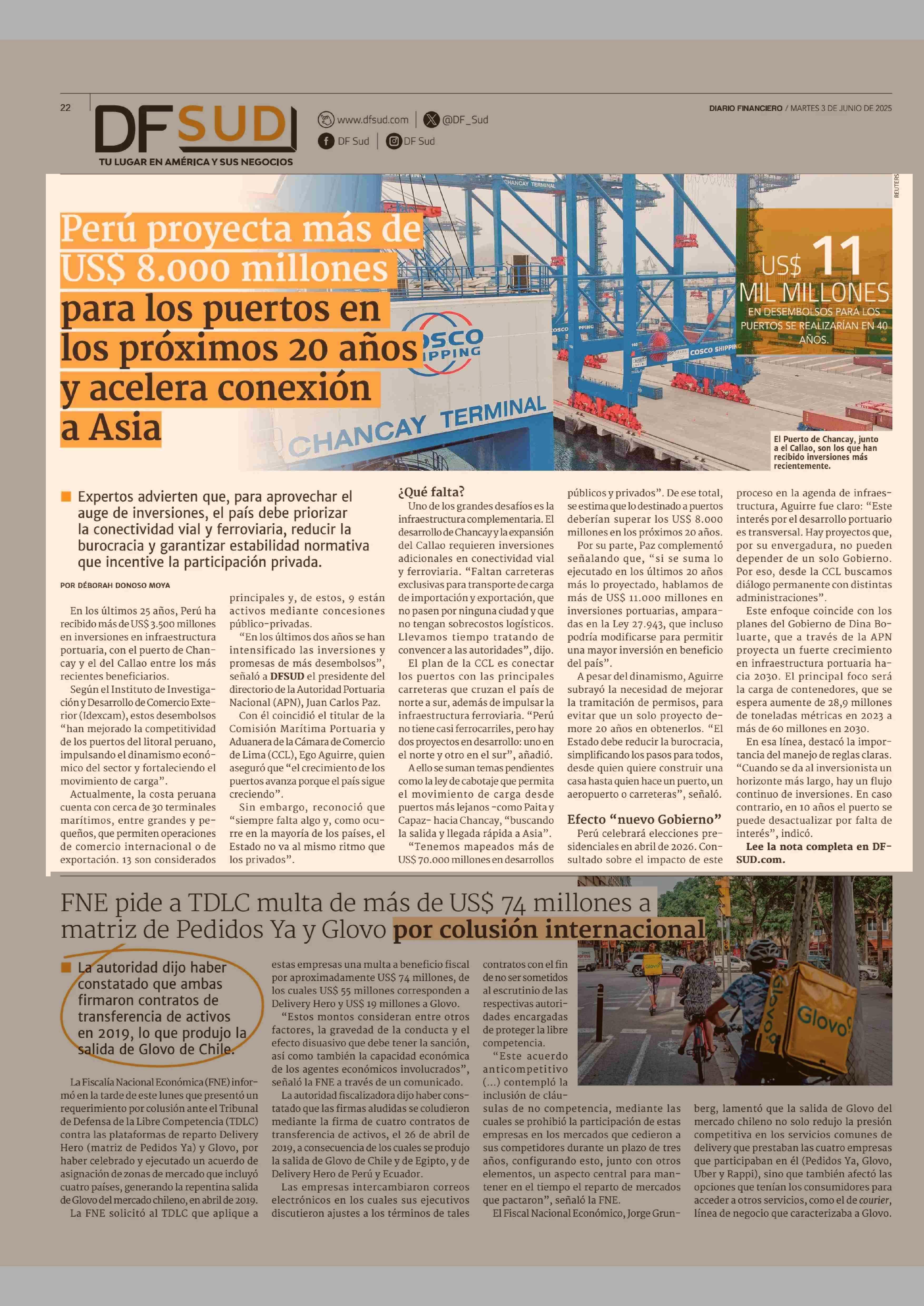 Perú proyecta más de US$ 8.000 millones para los puertos en los próximos años y acelera conexión a Asia 03-06-2025 Diario Financiero |