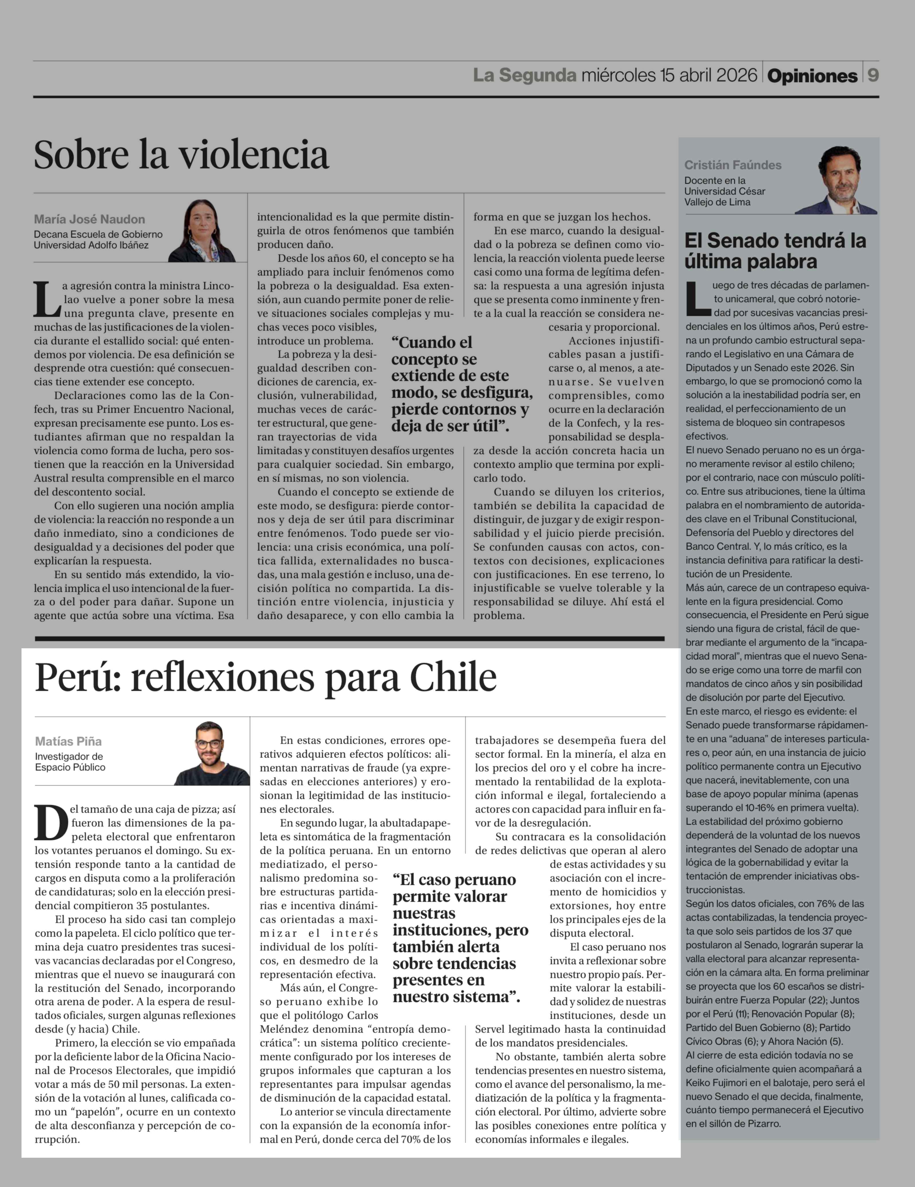 Columnas de Opinión: Perú: reflexiones para Chile 15-04-2026 La Segunda |