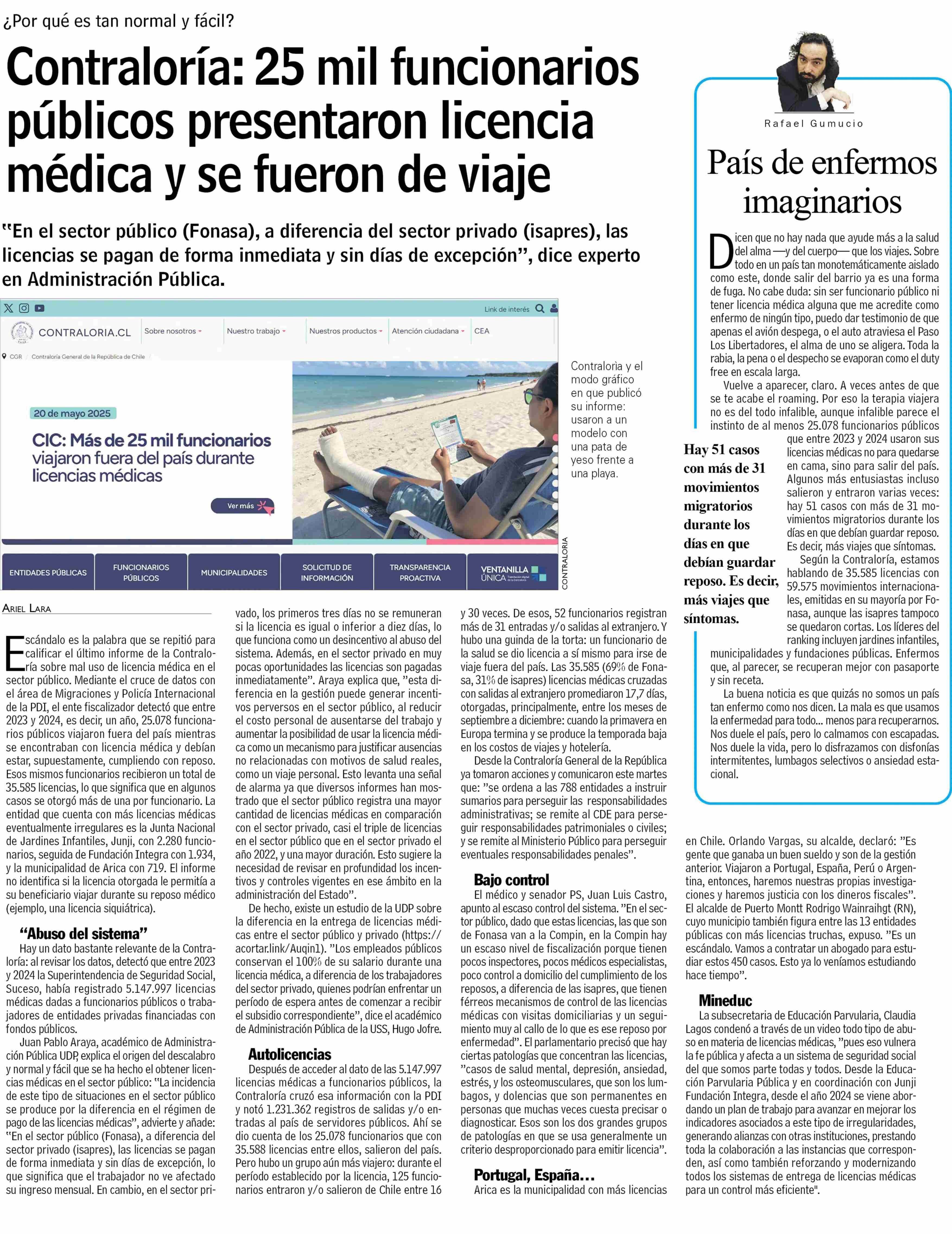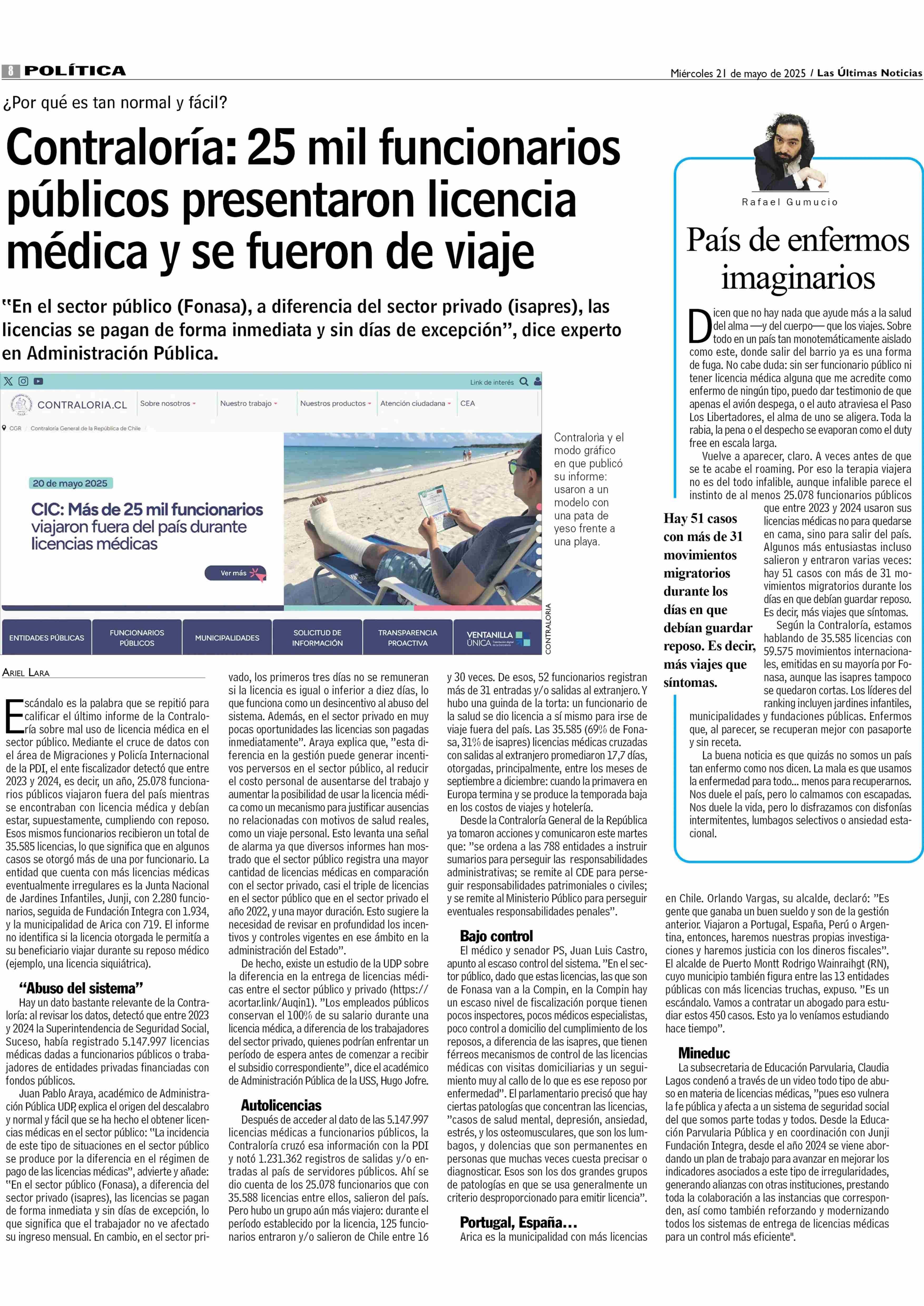 Contraloría: 25 mil funcionarios públicos presentaron licencia médica y se fueron de viaje 21-05-2025 Las Últimas Noticias |