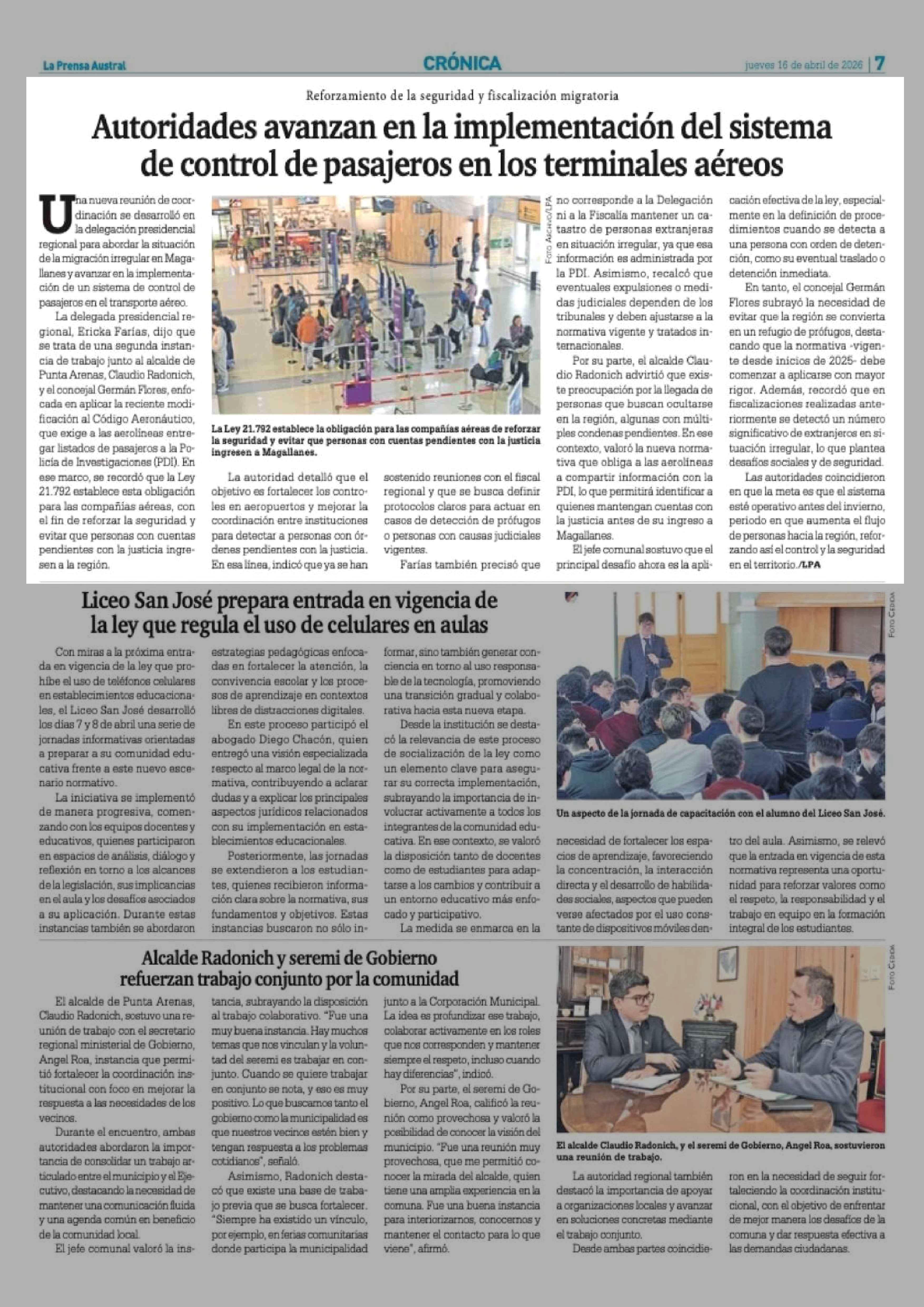 Autoridades avanzan en la implementación del sistema de control de pasajeros en los terminales aéreos 16-04-2026 La Prensa Austral |