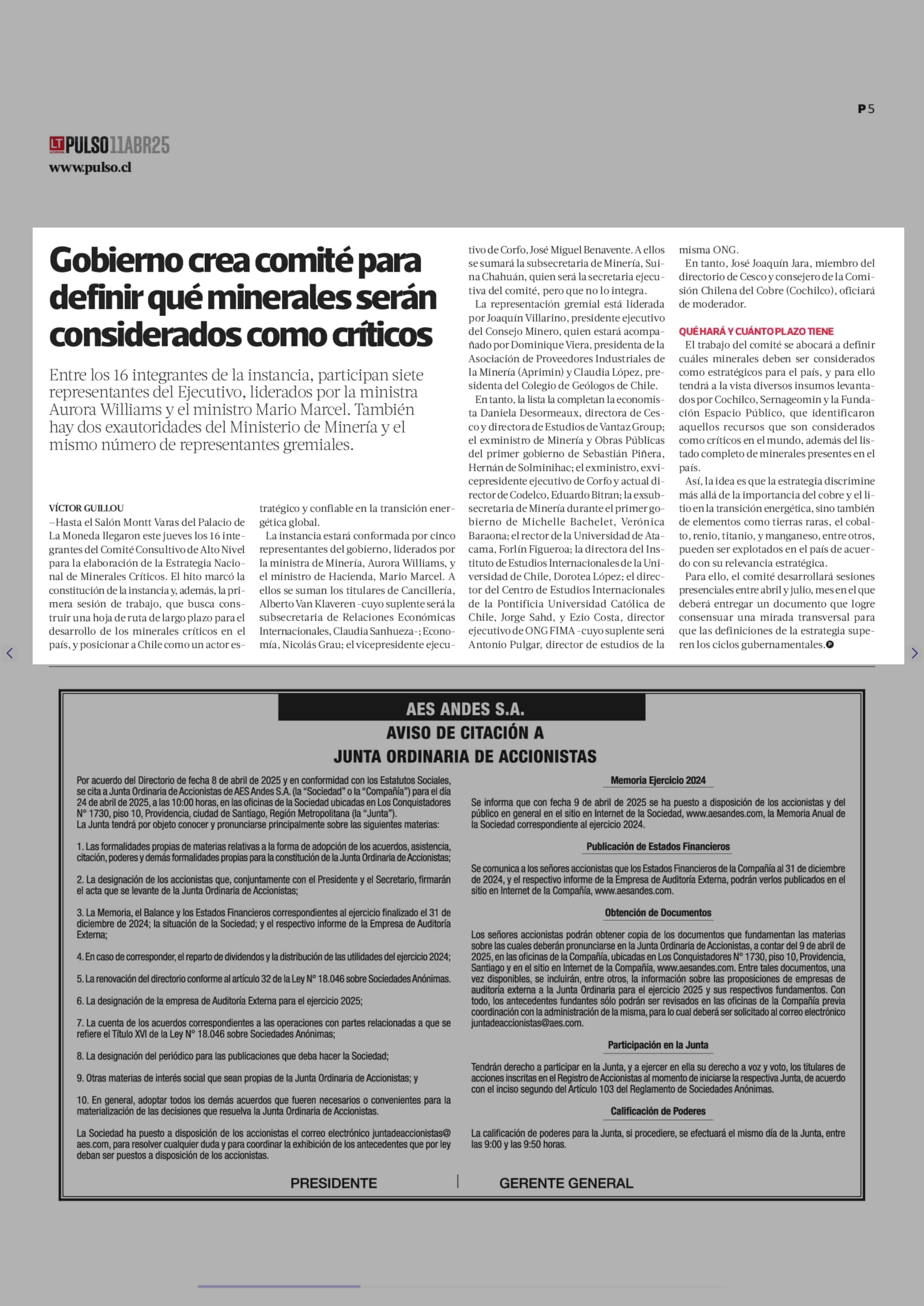 Gobierno crea comité para definir qué minerales serán considerados como críticos 11-04-2025 La Tercera |