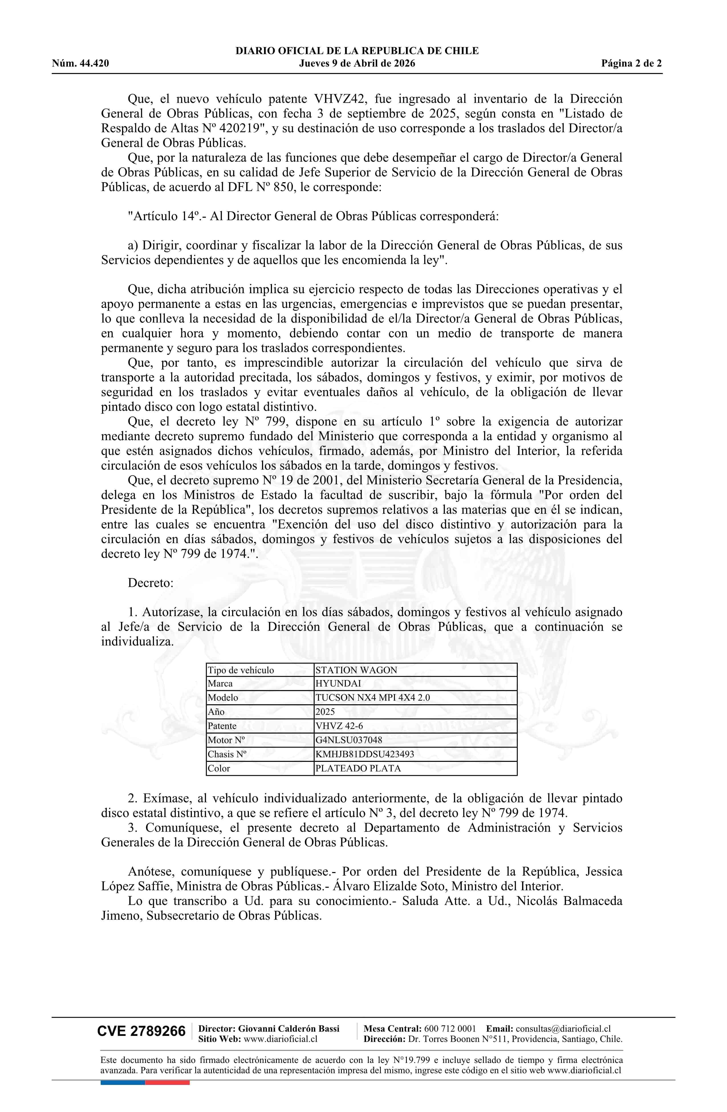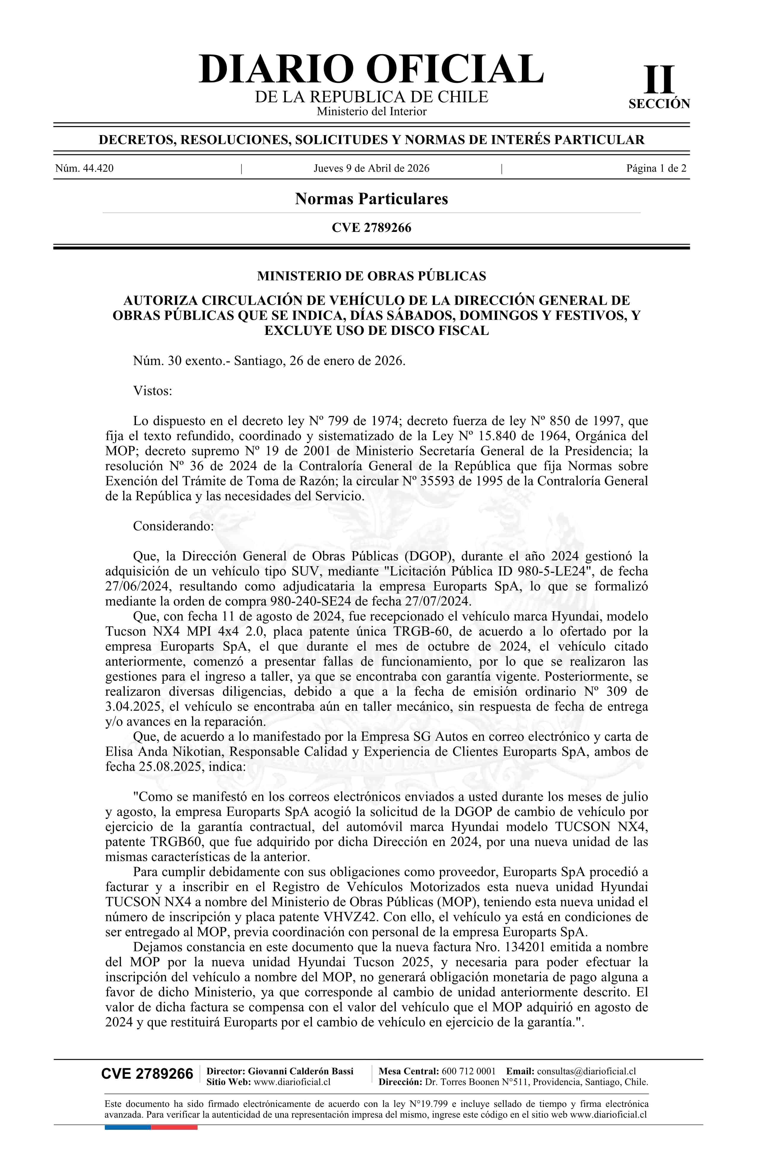 | Título: | Decreto exento número 30, de 2026.- Autoriza circulación de vehículo de la Dirección General de Obras Públicas que se indica, en días sábado, domingo y festivos, y lo excluye del uso de disco fiscal |
