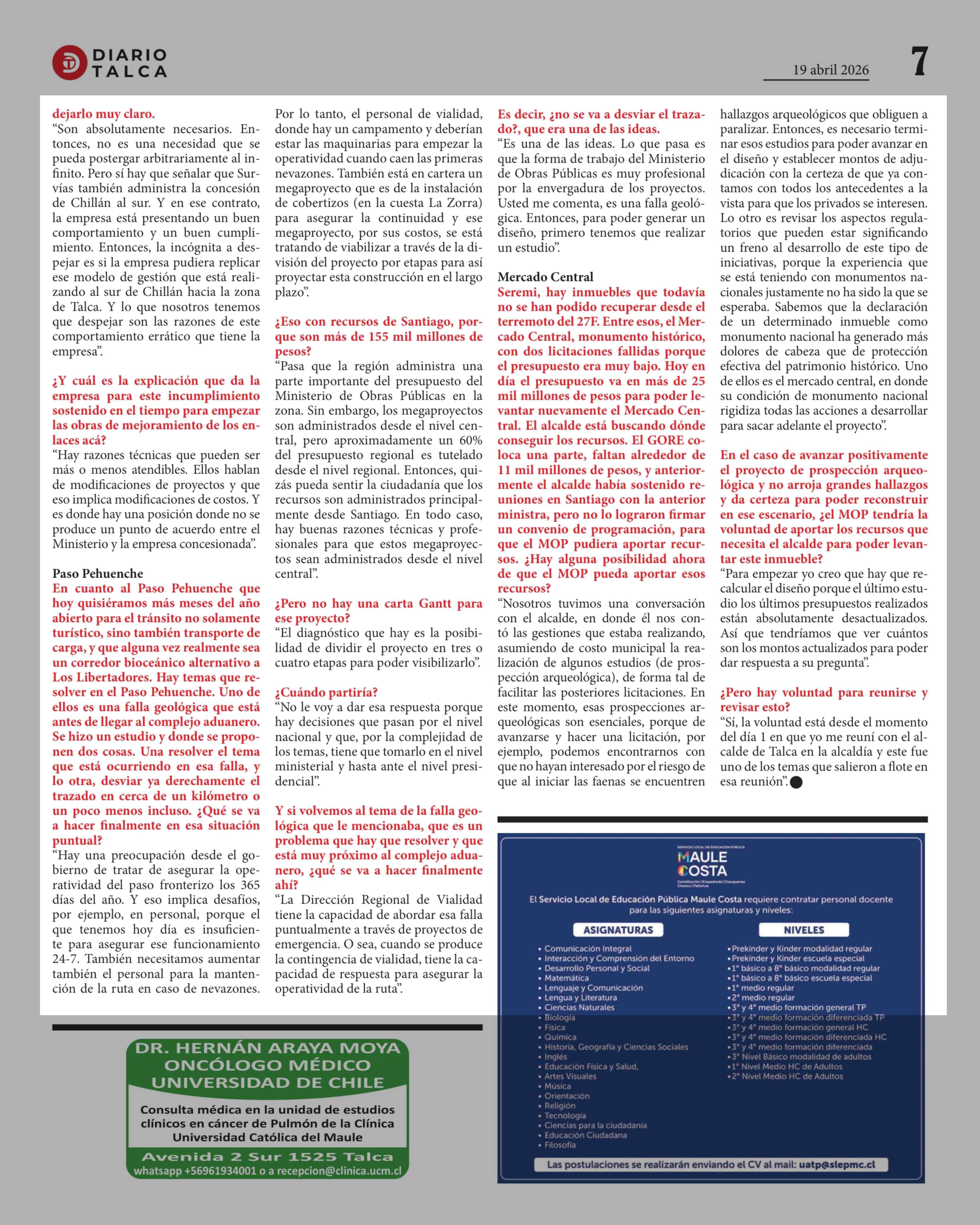"Los enlaces (a Talca) tienen que construirse" 19-04-2026 Diario Talca |