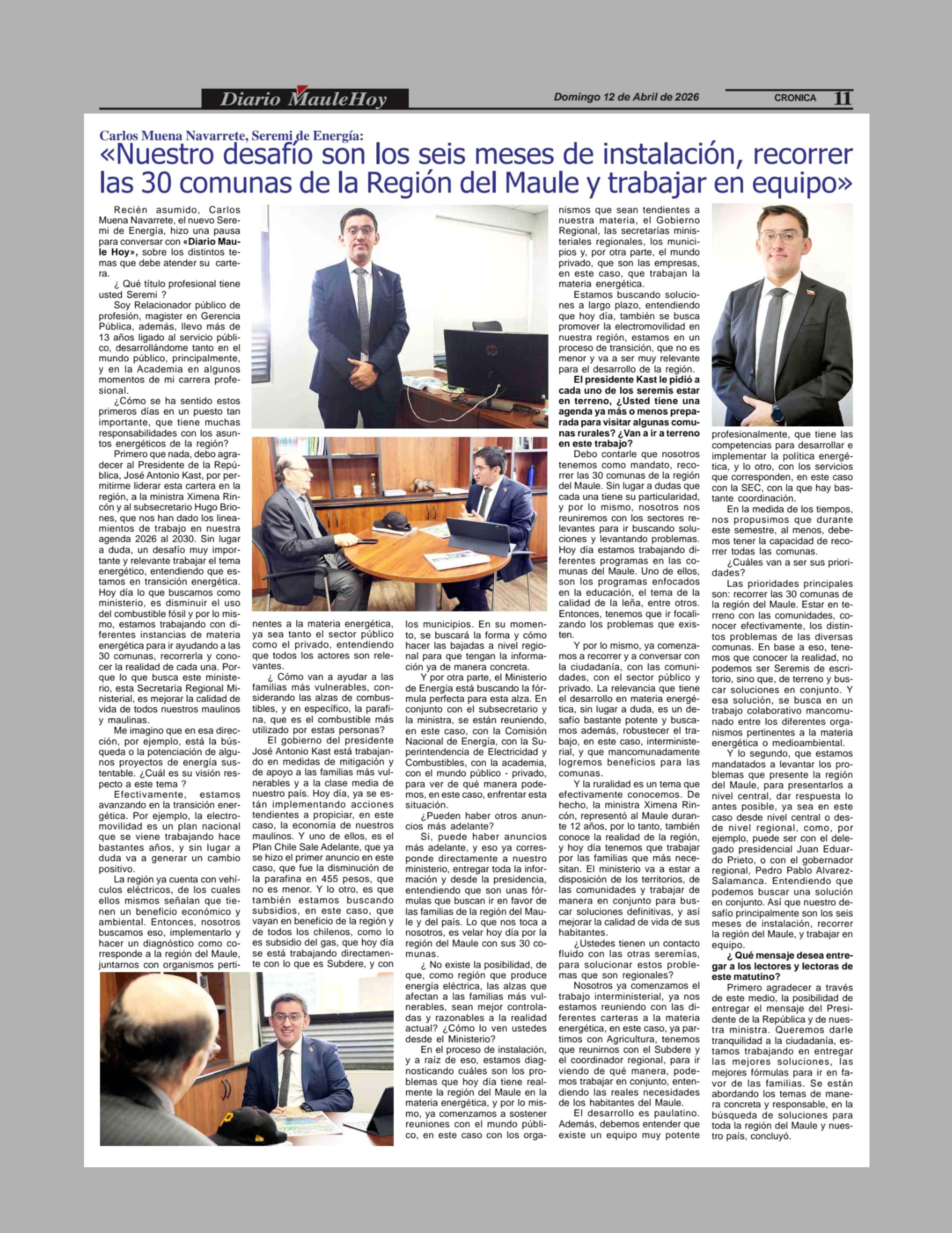 «Nuestro desafío son los seis meses de instalación, recorrer las 30 comunas de la Región del Maule y trabajar en equipo» 12-04-2026 Maule Hoy |