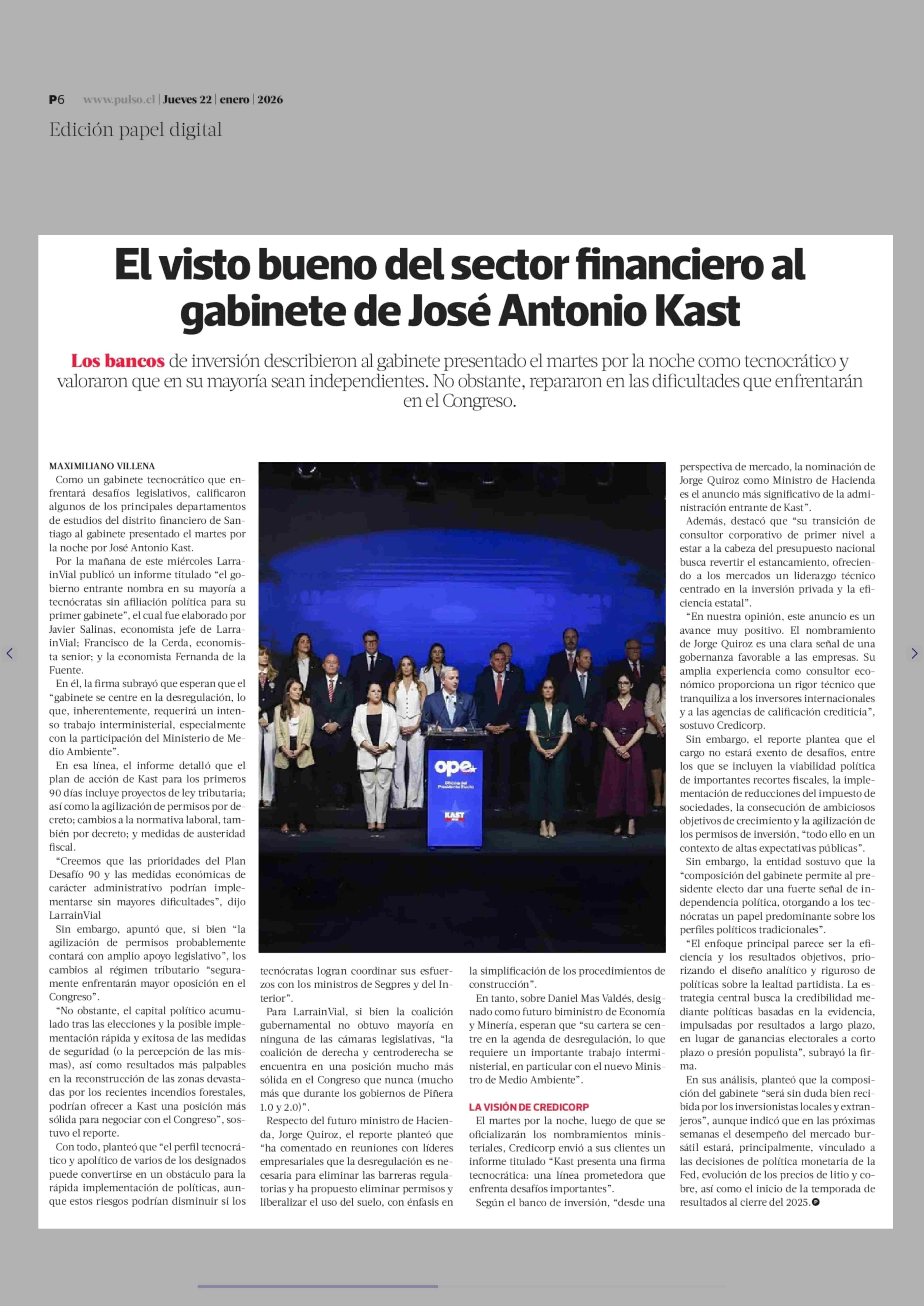 El visto bueno del sector financiero al gabinete de José Antonio Kast 22-01-2026 La Tercera |