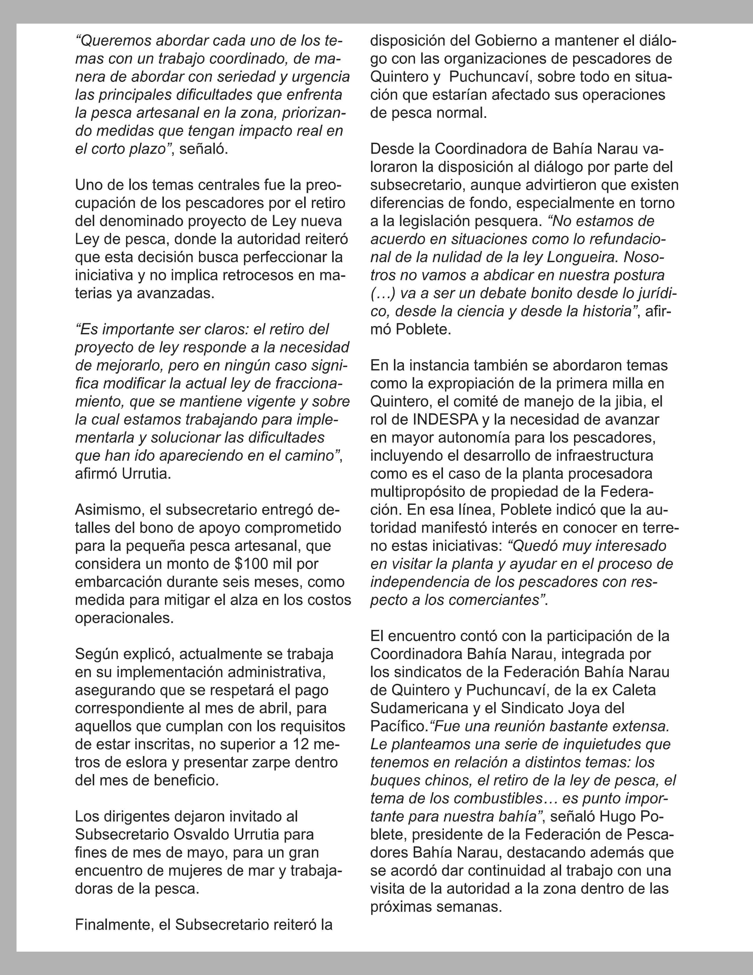 | Título: | Subsecretario de Pesca recibe a pescadores de Quintero - Puchuncaví y propone trabajo conjunto para enfrentar tareas más urgentes |