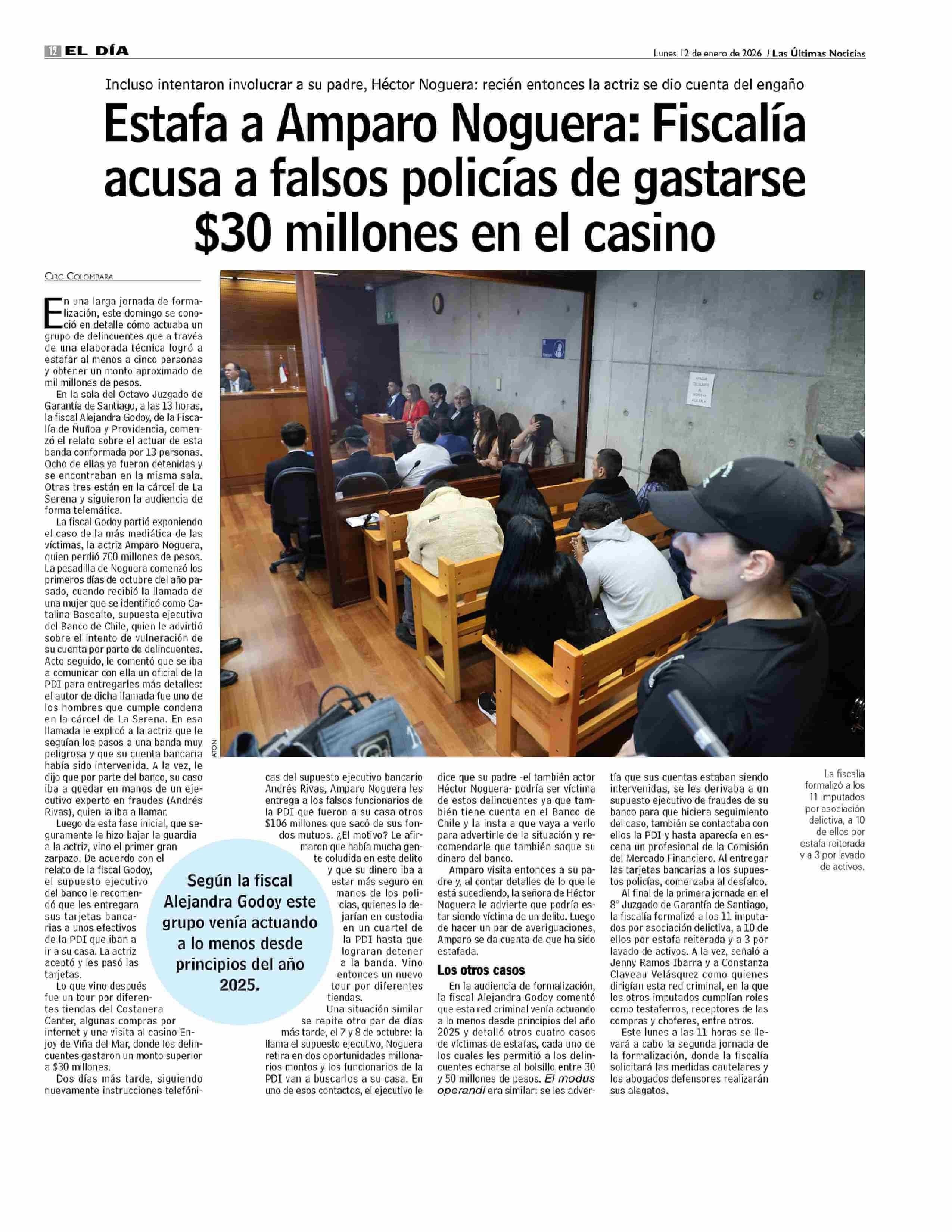 Estafa a Amparo Noguera: Fiscalía acusa a falsos policías de gastarse $30 millones en el casino 12-01-2026 Las Últimas Noticias |