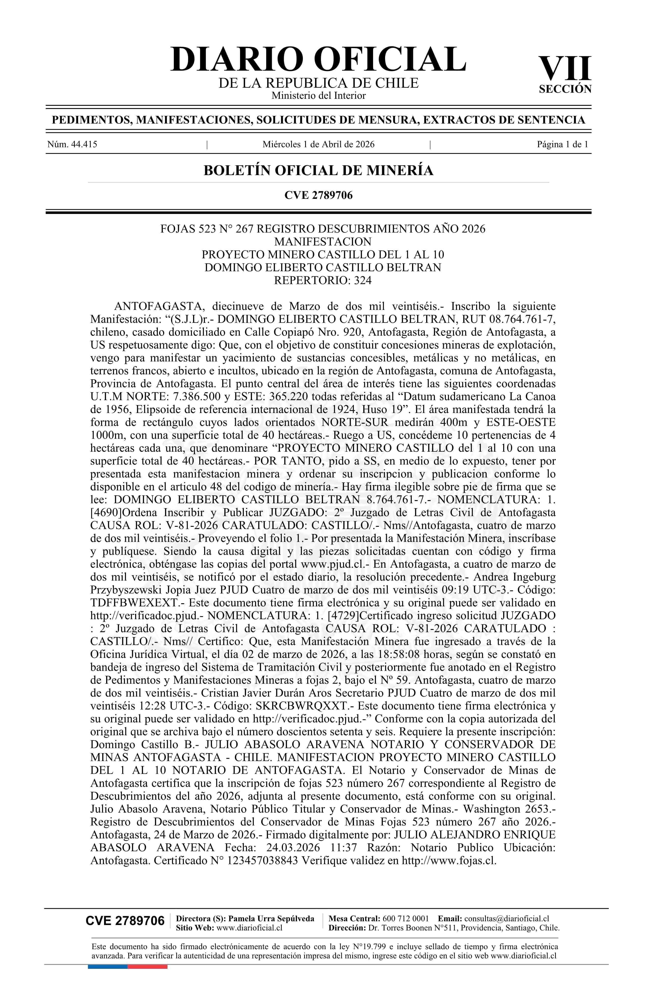 PROYECTO MINERO CASTILLO del 1 al 10 / Castillo Beltrán Domingo Eliberto 01-04-2026 DIARIO OFICIAL CHILE - BOLETÍN OFICIAL DE MINERÍA |