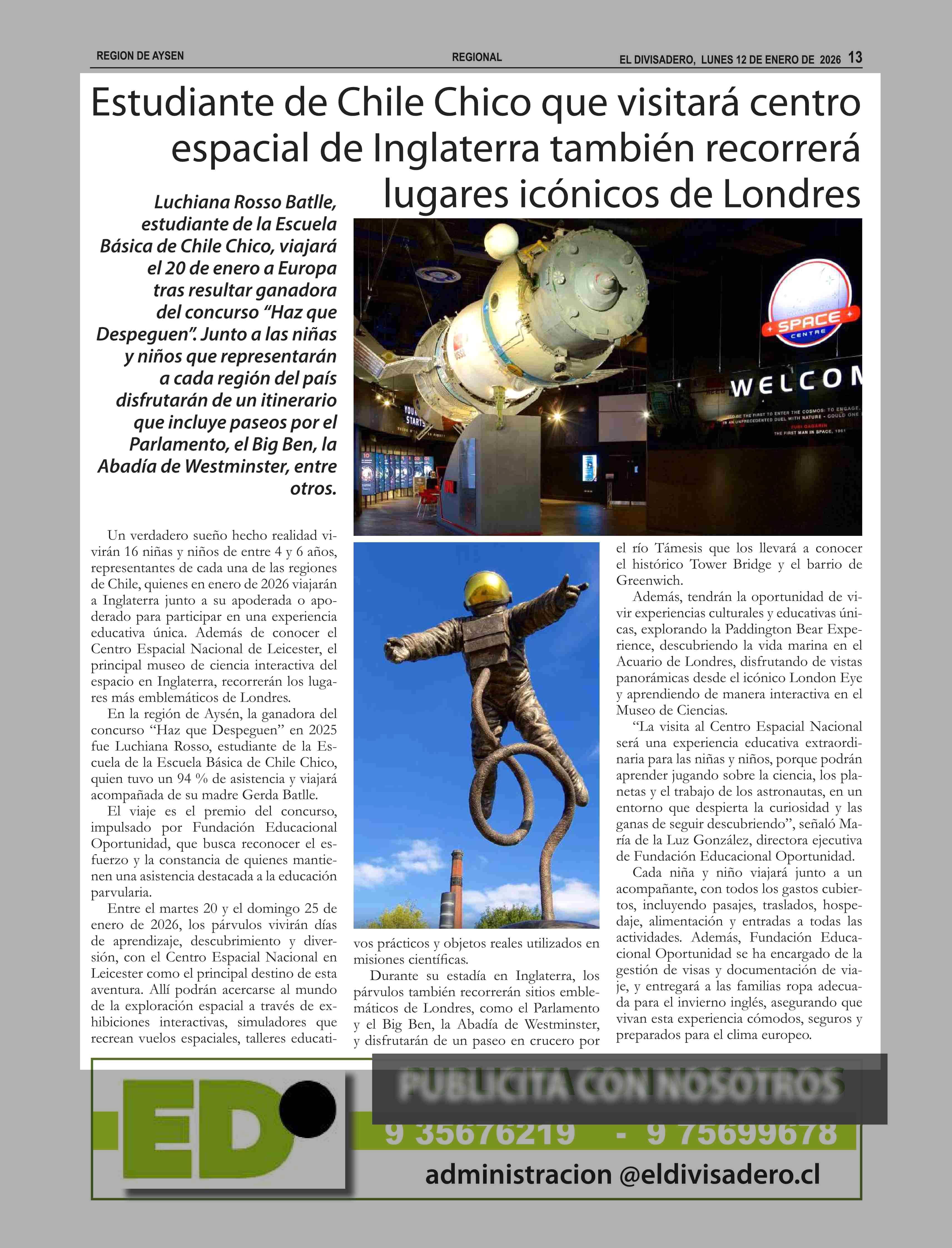Estudiante de Chile Chico que visitará centro espacial de Inglaterra también recorrerá lugares icónicos de Londres 12-01-2026 El Divisadero |