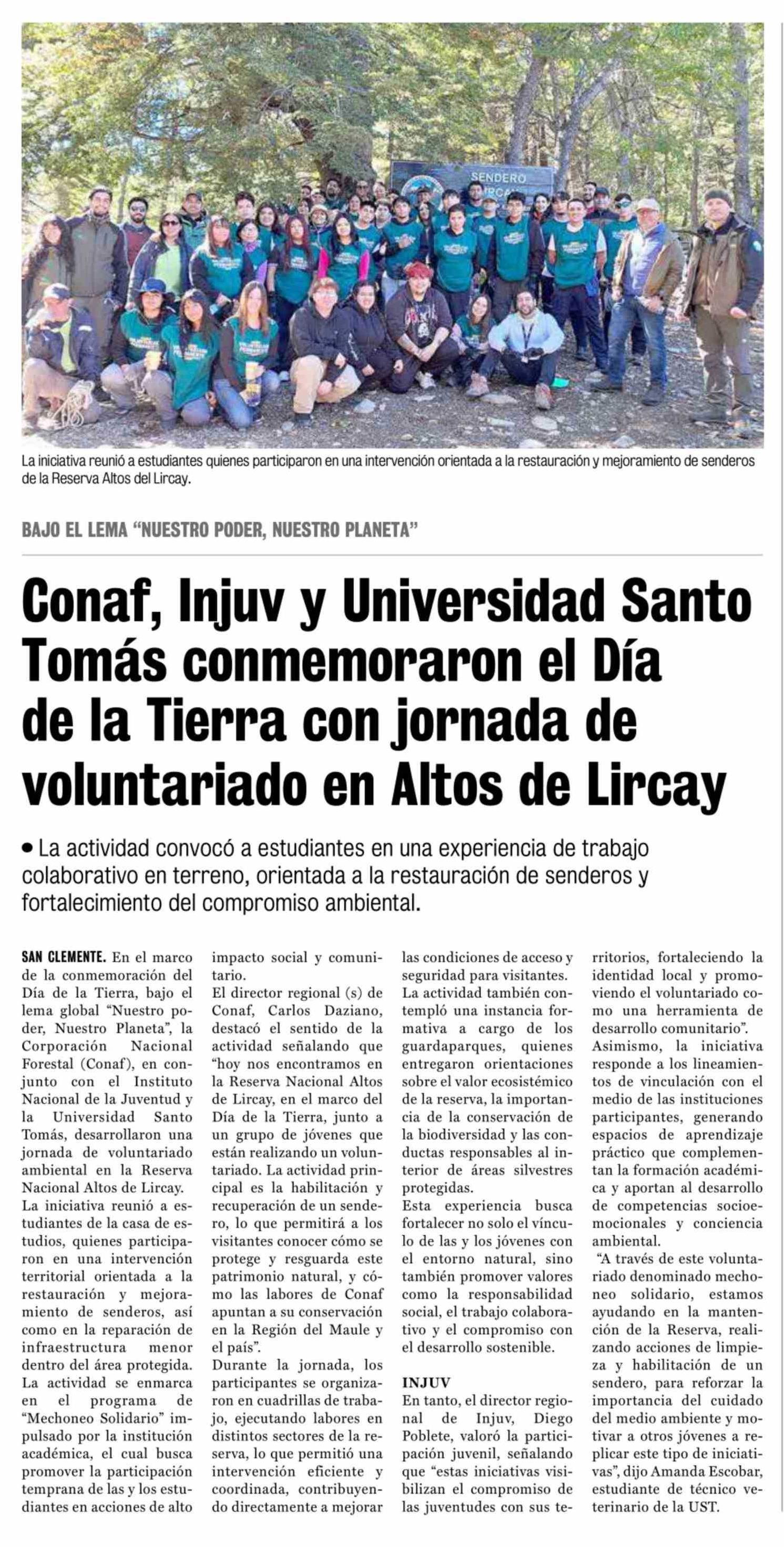 Título: Conaf, Injuv y Universidad Santo Tomás conmemoraron el Día de la Tierra con jornada de voluntariado en Altos de Lircay