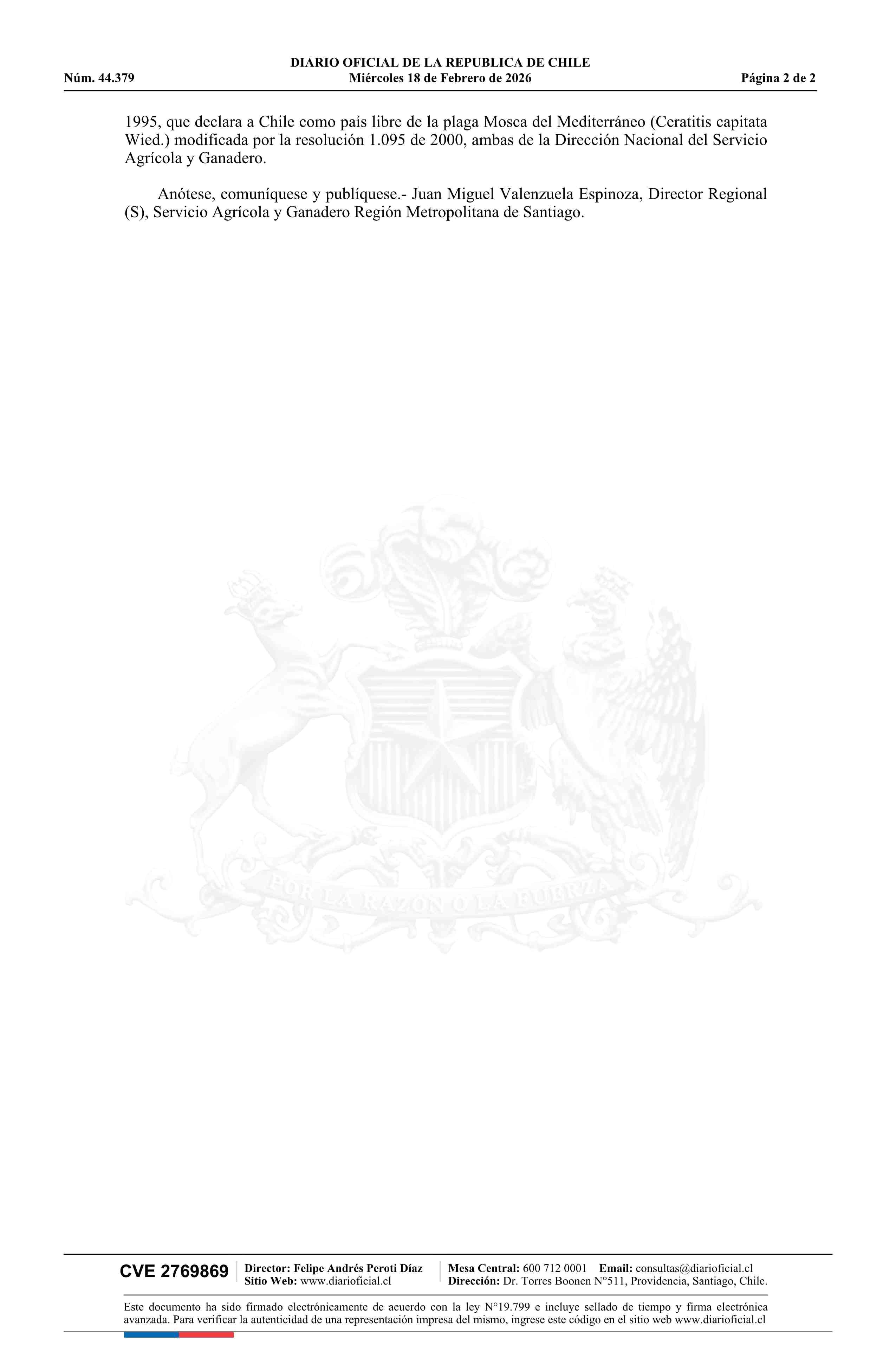 Resolución exenta número 335, de 2026.- Pone término a vigilancia intensiva establecida ante la detección de un único ejemplar de Mosca del Mediterráneo (Ceratitis capitata Wied.), comuna de Maipú 18-02-2026 DIARIO OFICIAL CHILE - BOLETÍN OFICIAL DE MINERÍA |