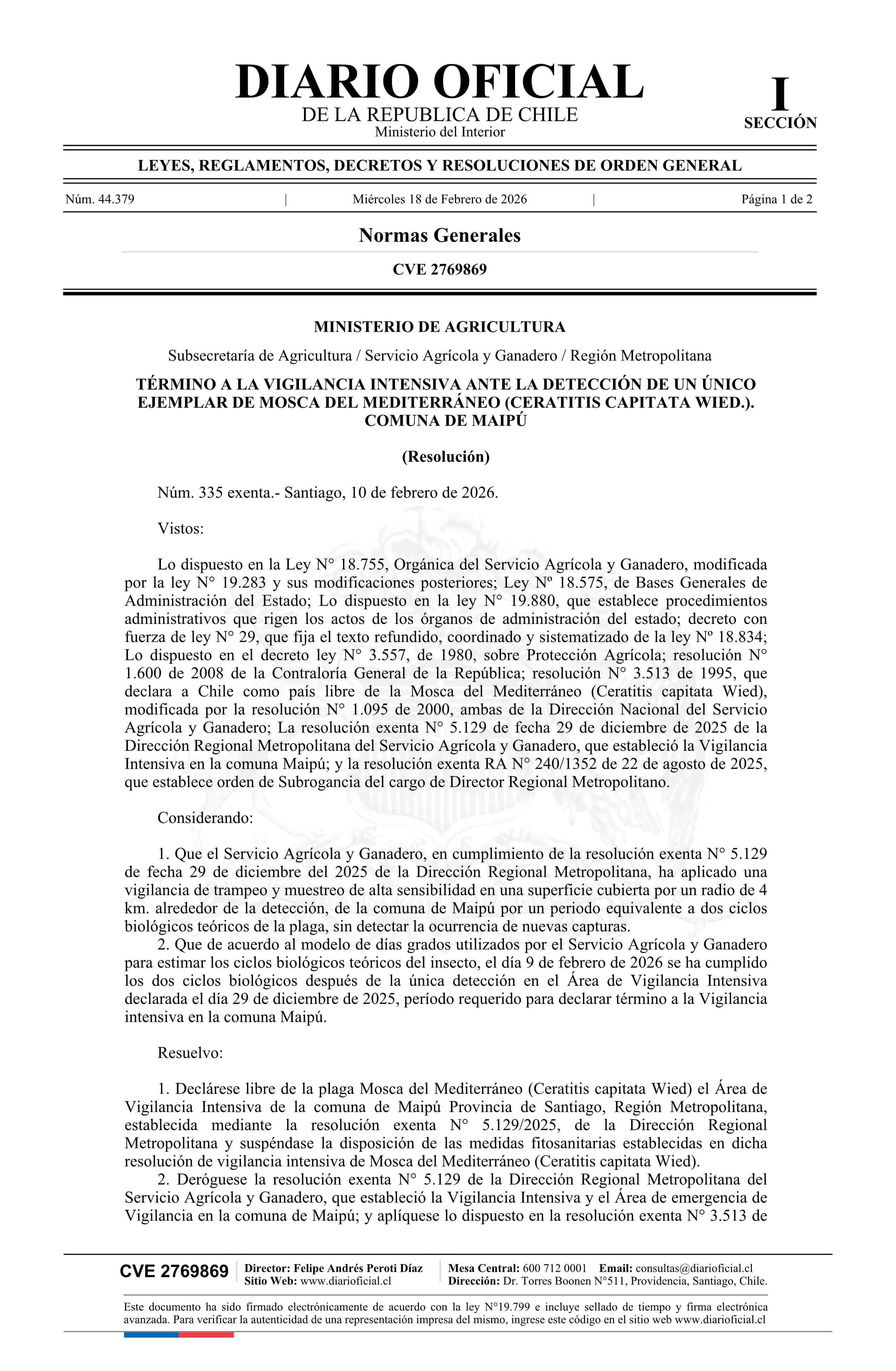 | Título: | Resolución exenta número 335, de 2026.- Pone término a vigilancia intensiva establecida ante la detección de un único ejemplar de Mosca del Mediterráneo (Ceratitis capitata Wied.), comuna de Maipú |