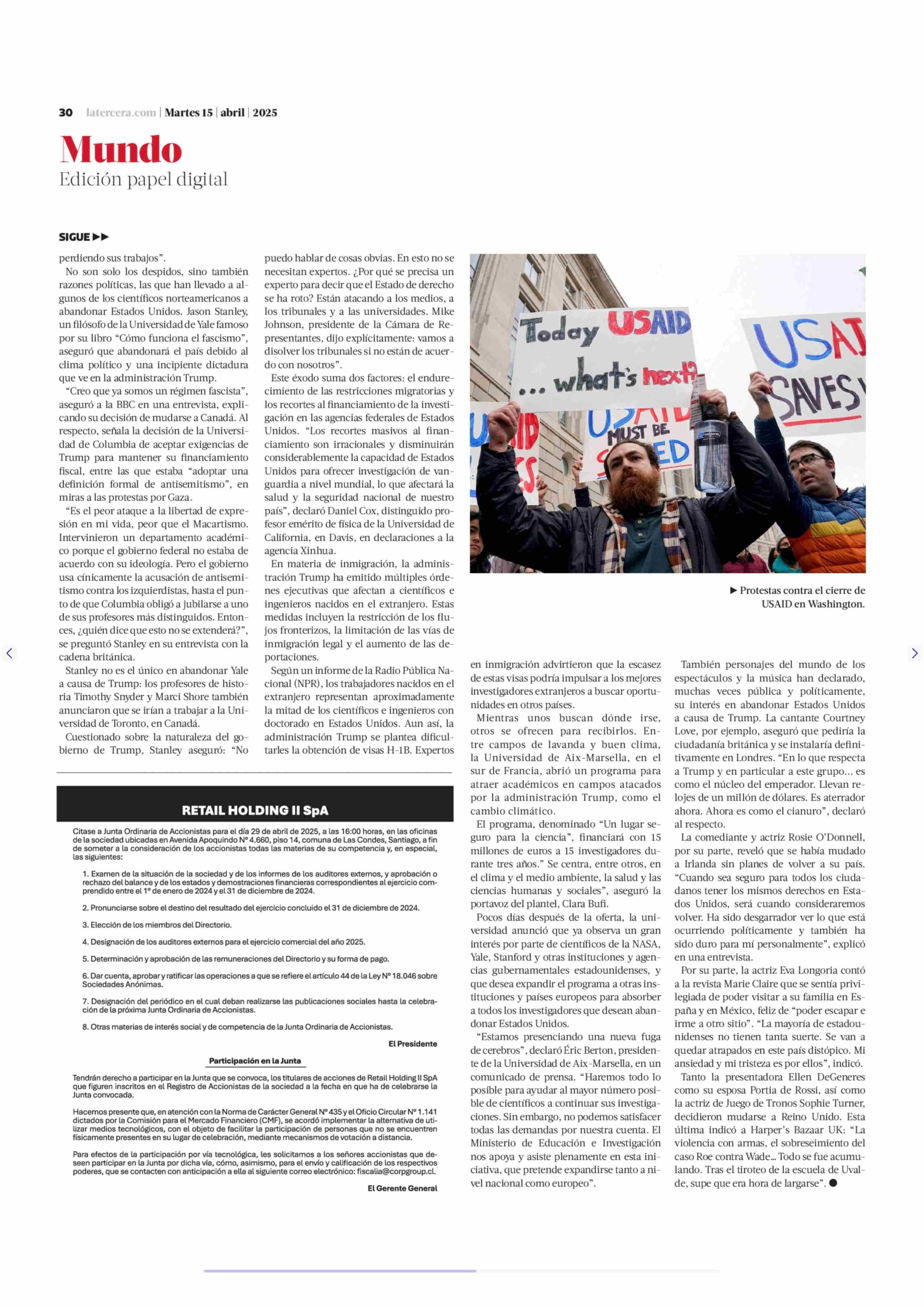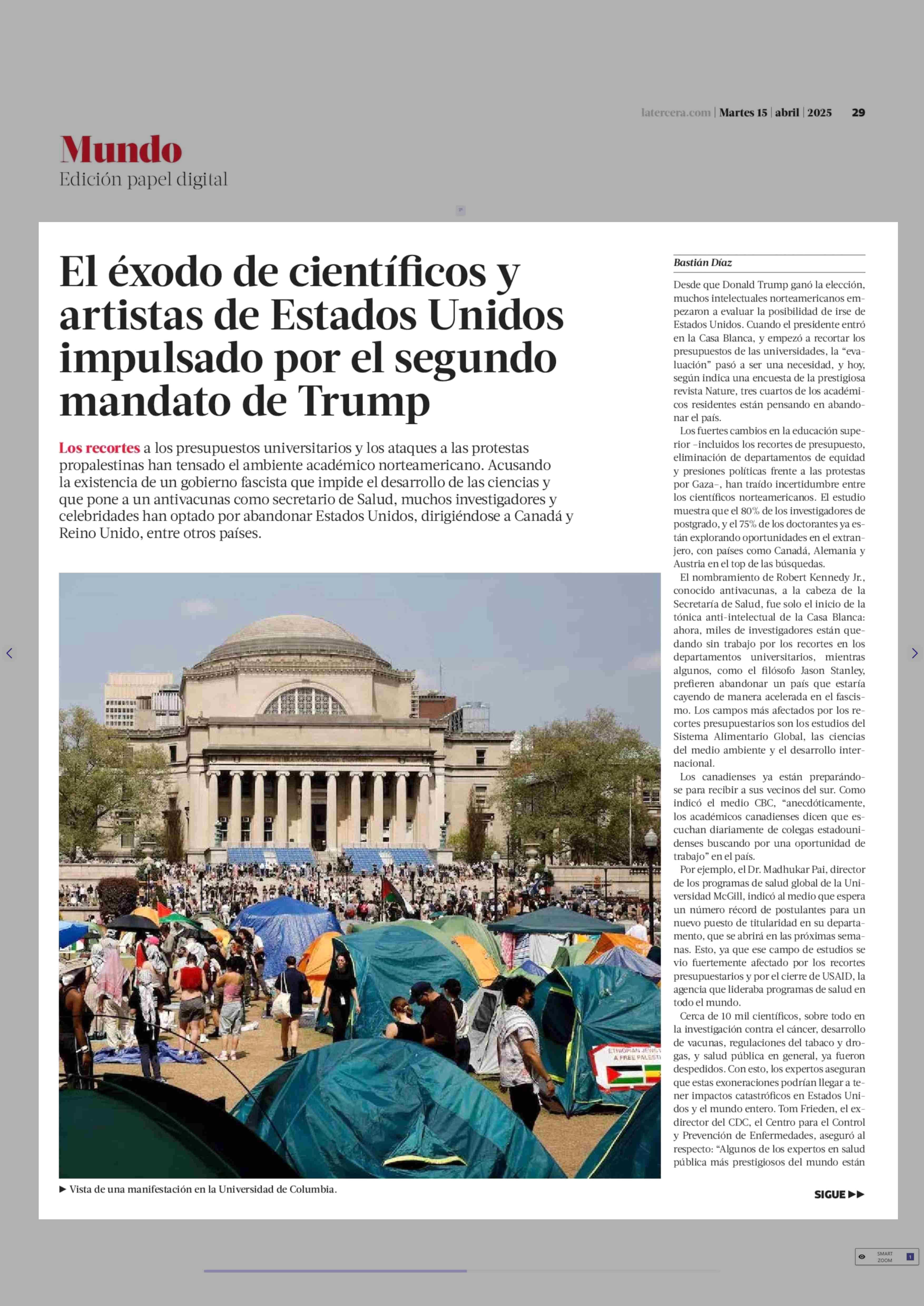El éxodo de científicos y artistas de Estados Unidos impulsado por el segundo mandato de Trump 15-04-2025 La Tercera |