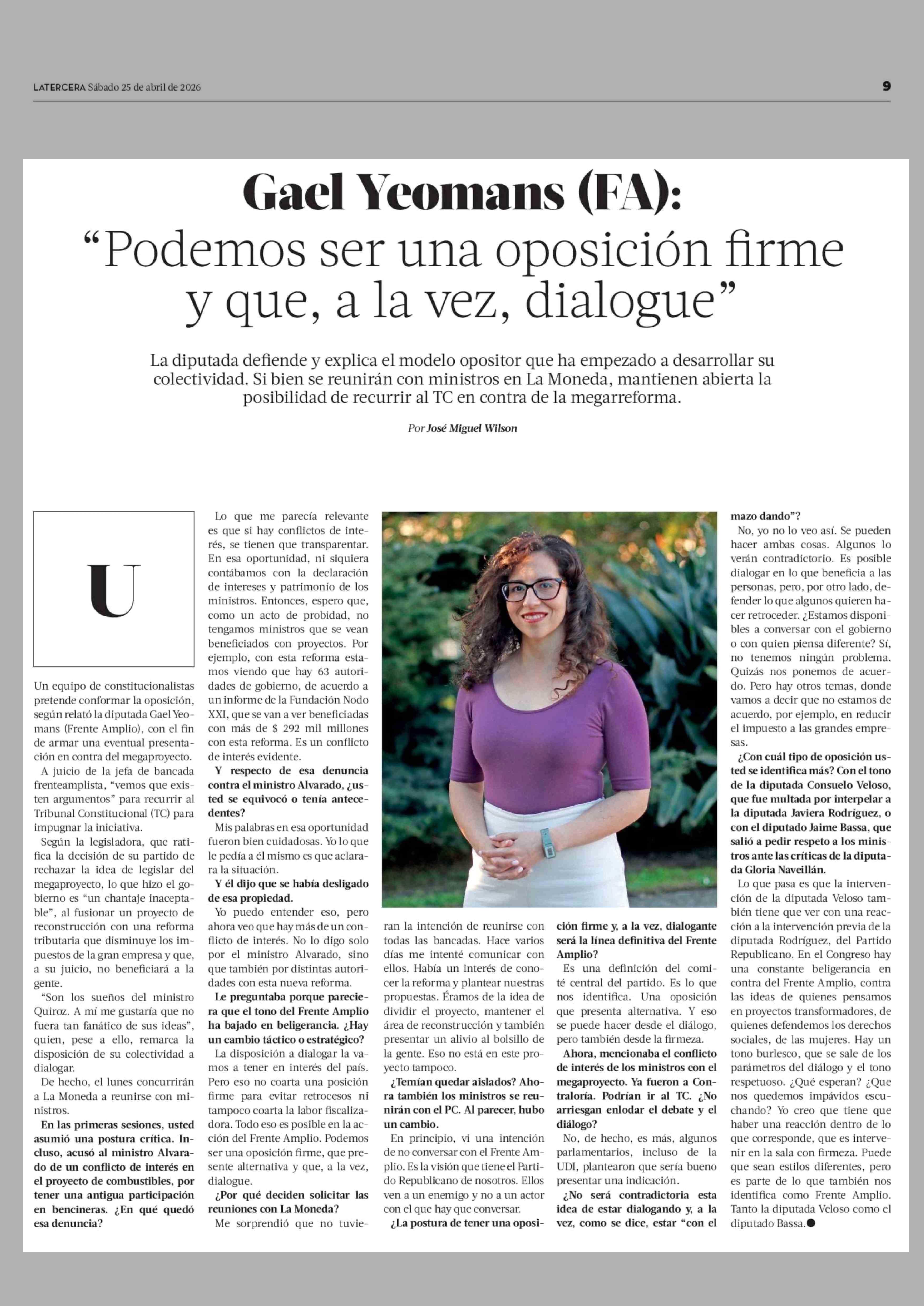 Gael Yeomans (FA): "Podemos ser una oposición firme y que, a la vez, dialogue" 25-04-2026 La Tercera |