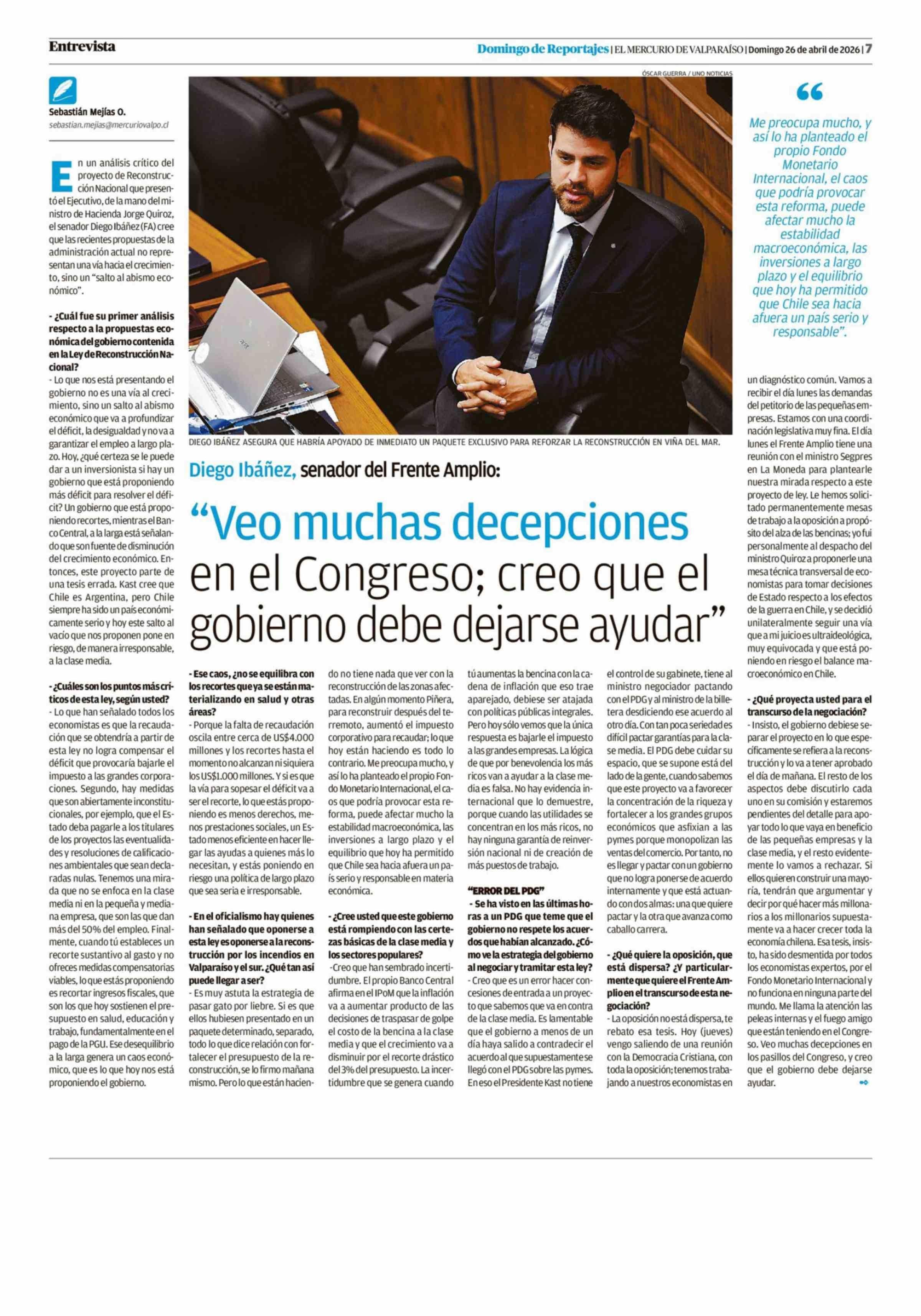 Título: "Veo muchas decepciones en el Congreso; creo que el gobierno debe dejarse ayudar"