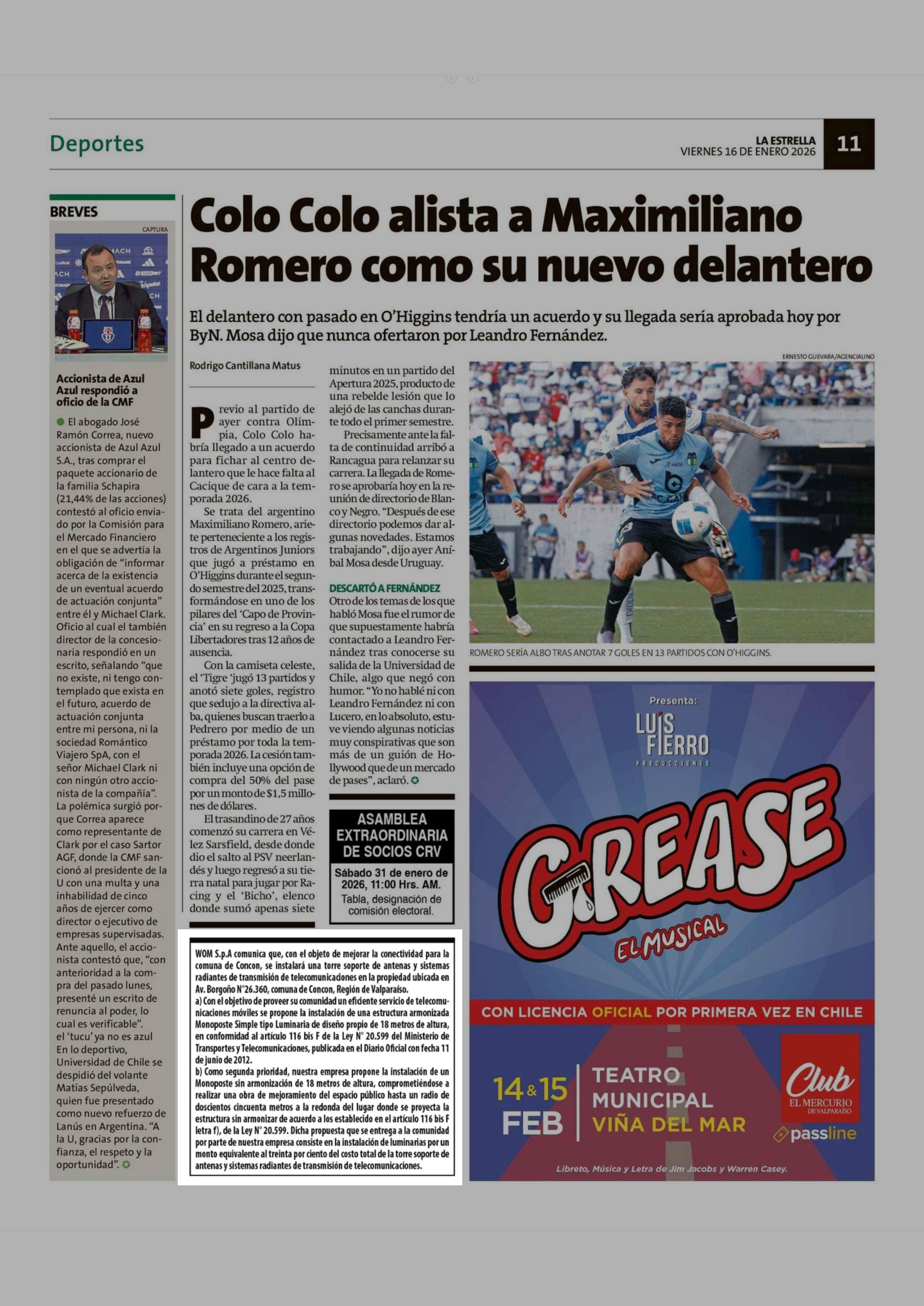 | Título: | Extractos: WOM S.p.A comunica que, con el objeto de mejorar la conectividad para la comuna de Concon, se instalará una torre soporte de antenas y sistemas radiantes de transmisión de telecomunicaciones en la propiedad ubicada en Av. Borgoño Nº26.360, comuna de Concon, Región de Valparaíso. a) Con el |