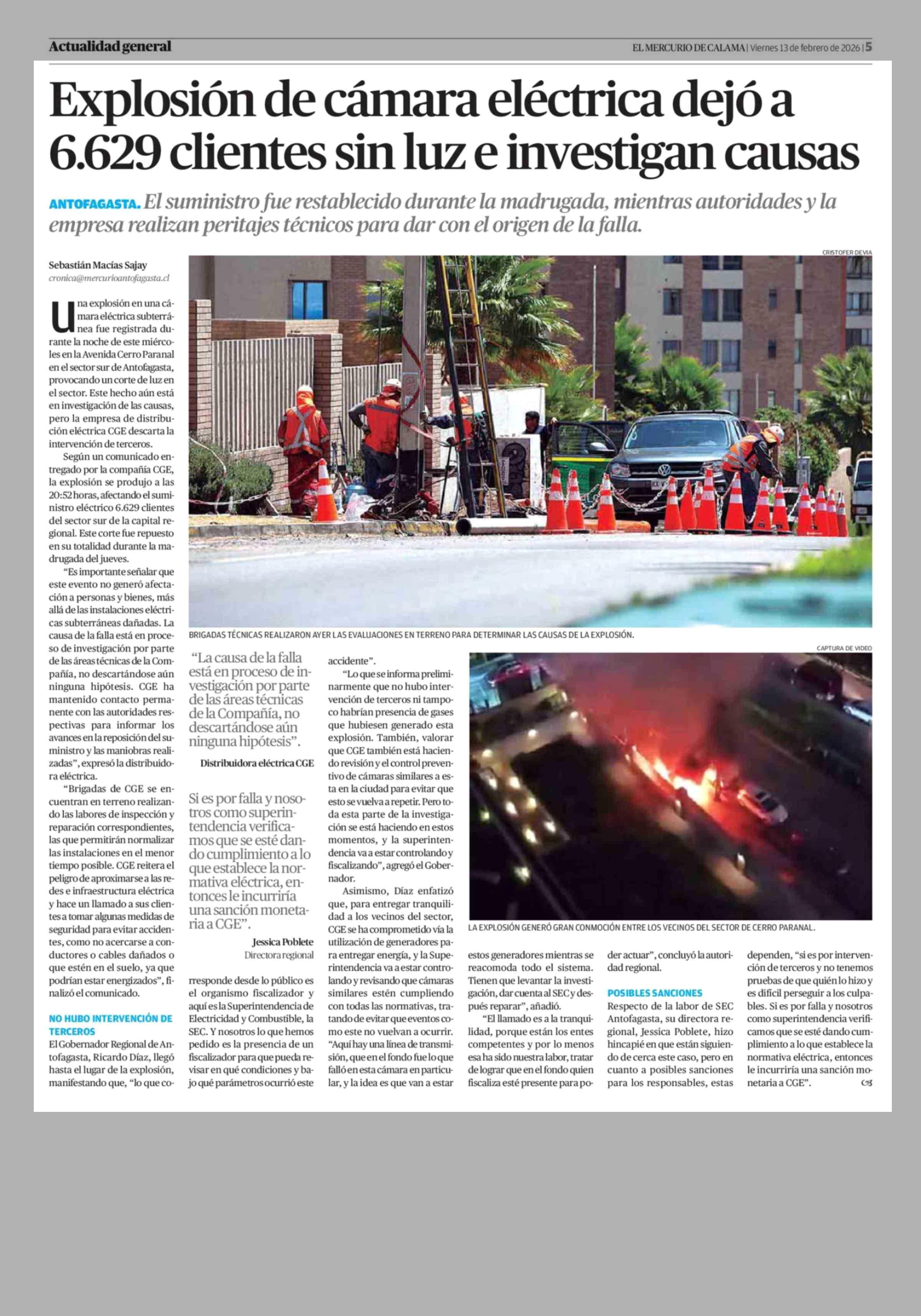 Explosión de cámara eléctrica dejó a 6.629 clientes sin luz e investigan causas 13-02-2026 El Mercurio de Calama |