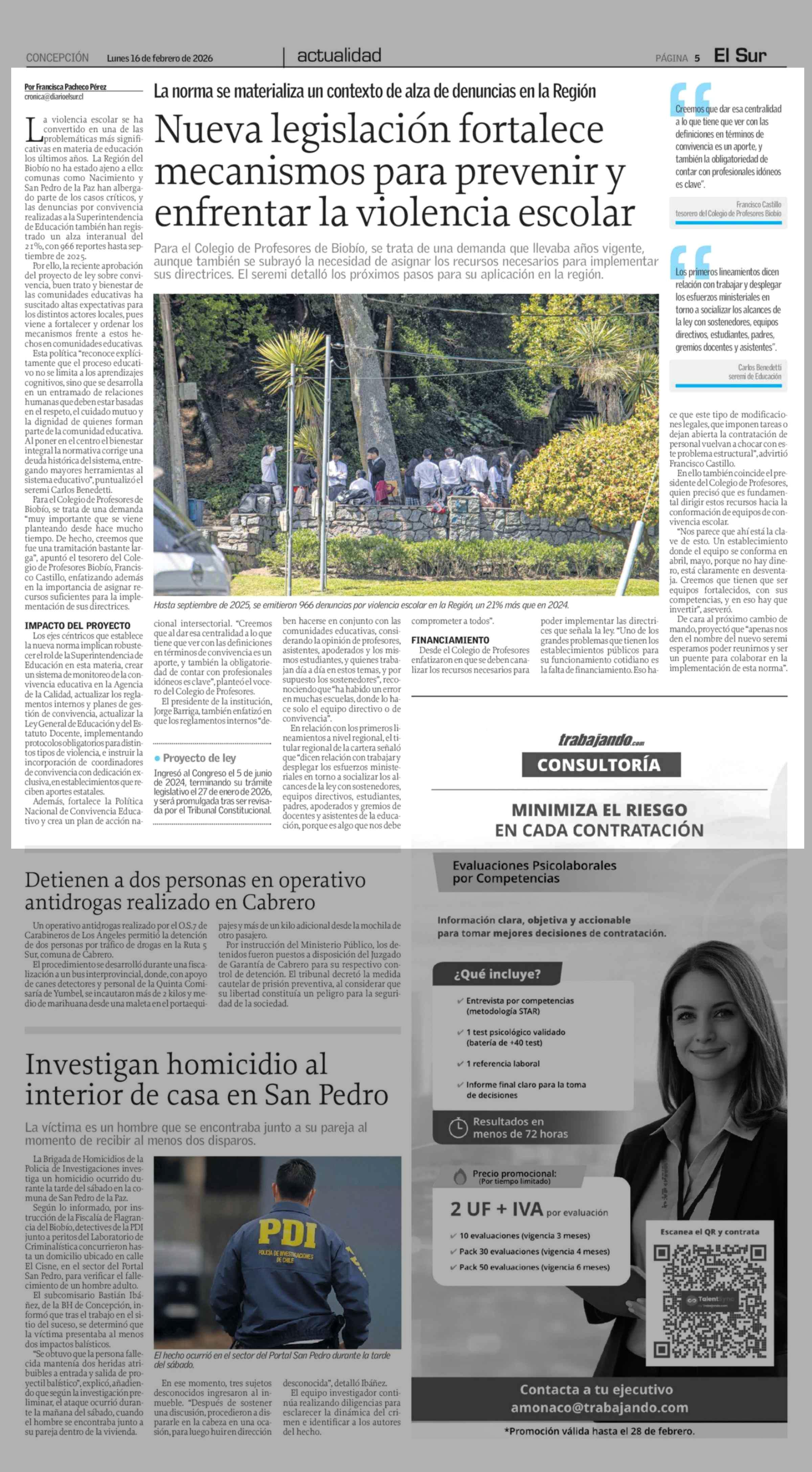 Nueva legislación fortalece mecanismos para prevenir y enfrentar la violencia escolar 16-02-2026 El Sur |