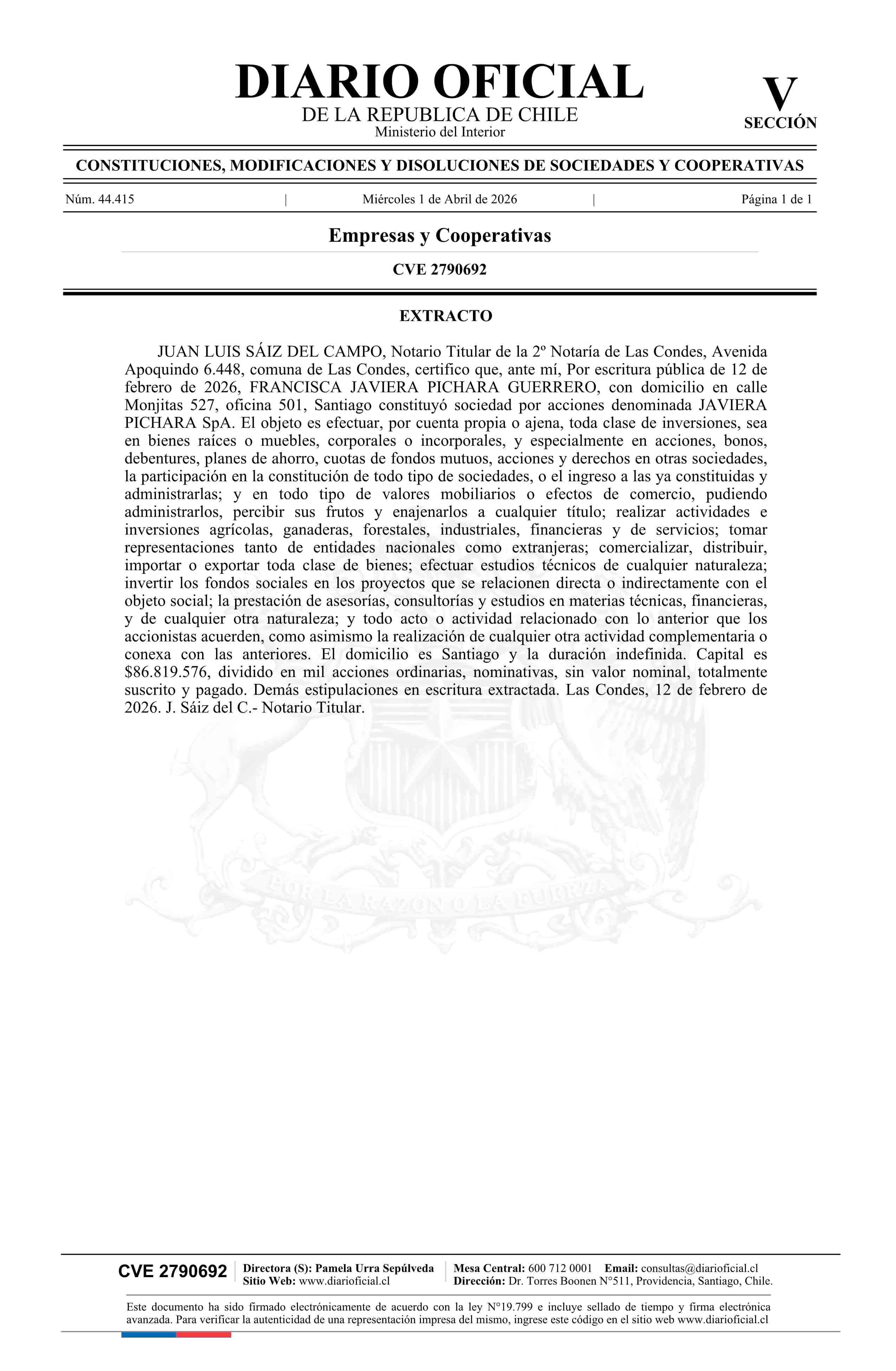 JAVIERA PICHARA SpA 01-04-2026 Diario Oficial Edición Electrónica |