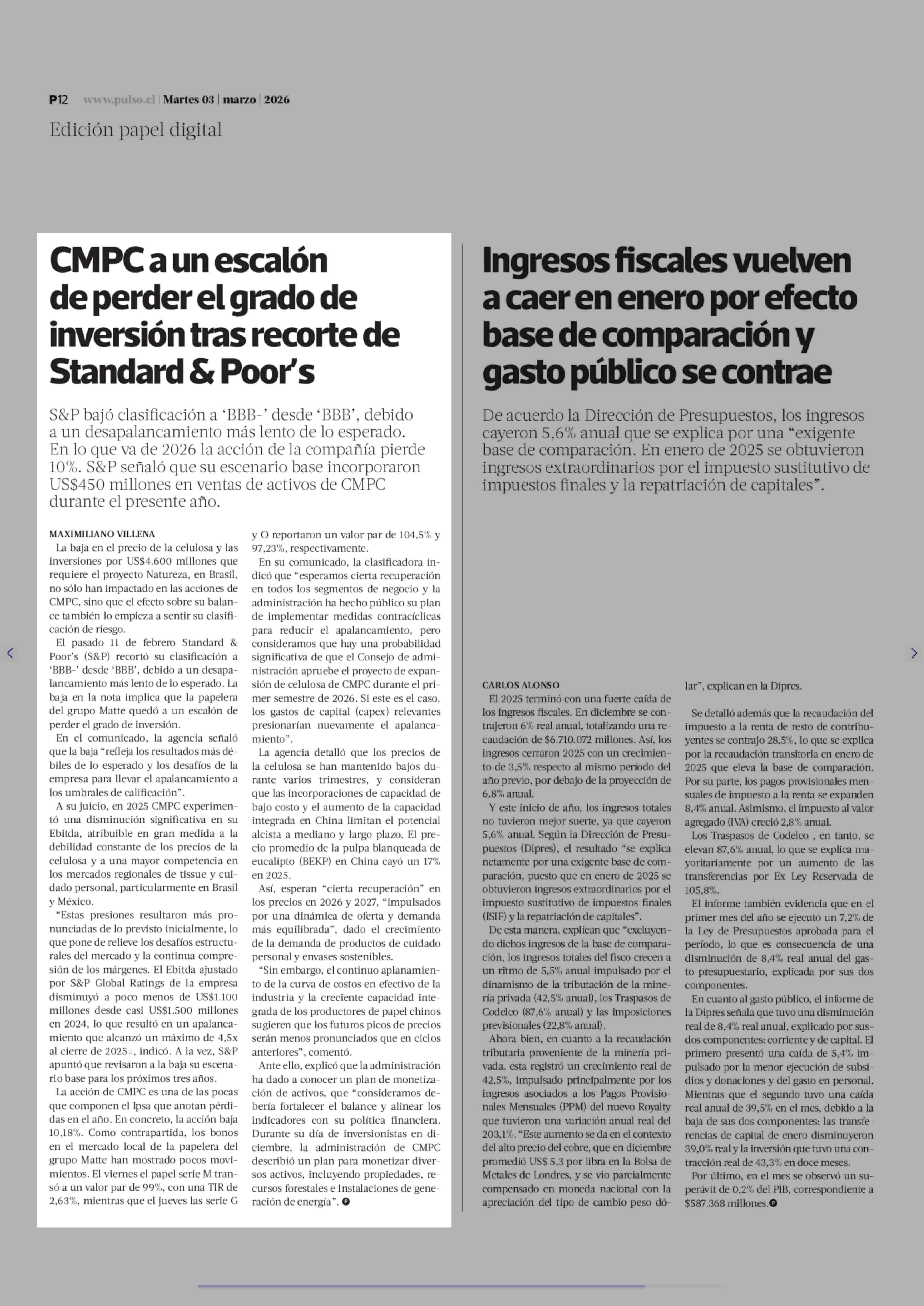 CMPC a un escalón de perder el grado de inversión tras recorte de Standard & Poor's 03-03-2026 La Tercera |