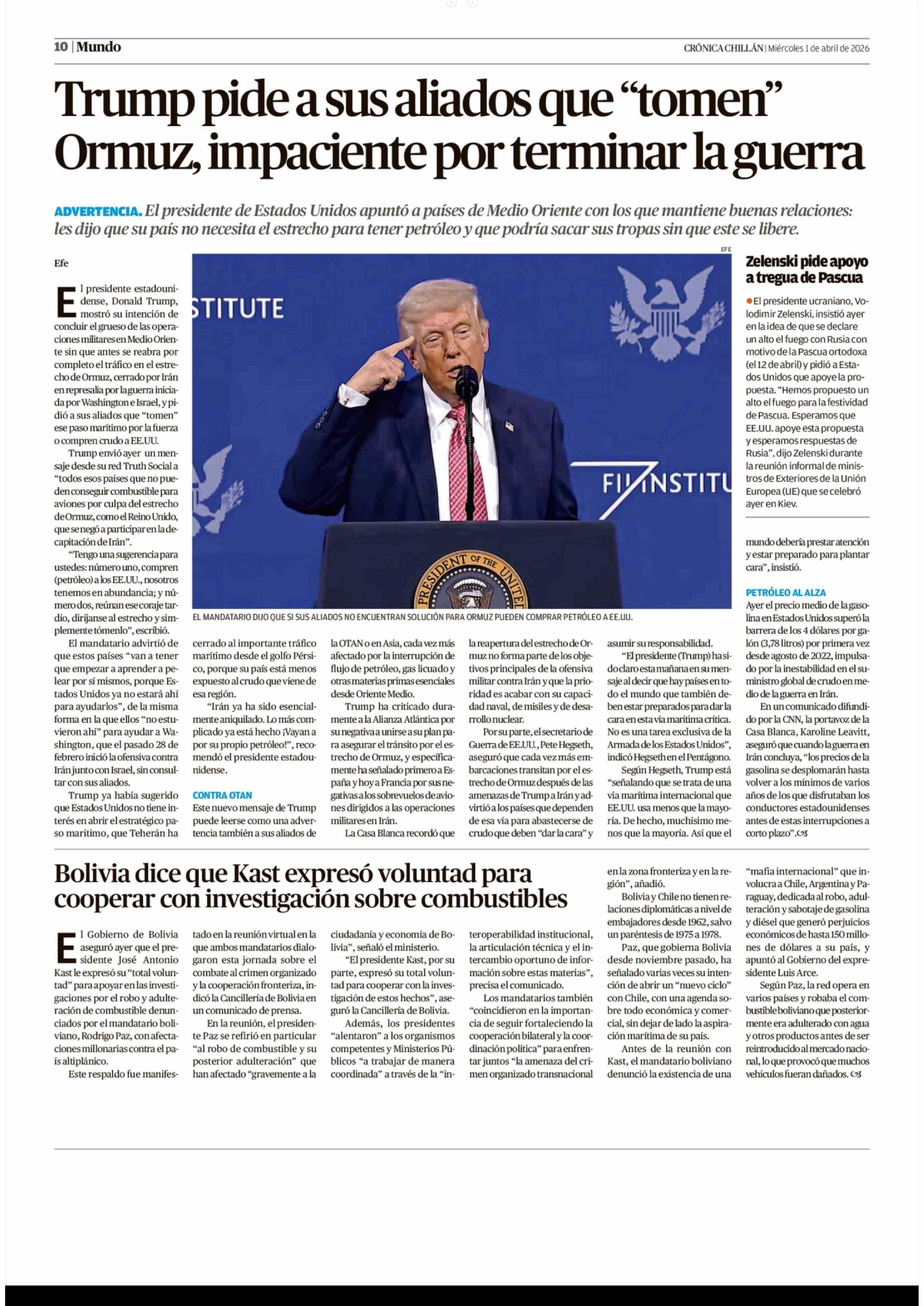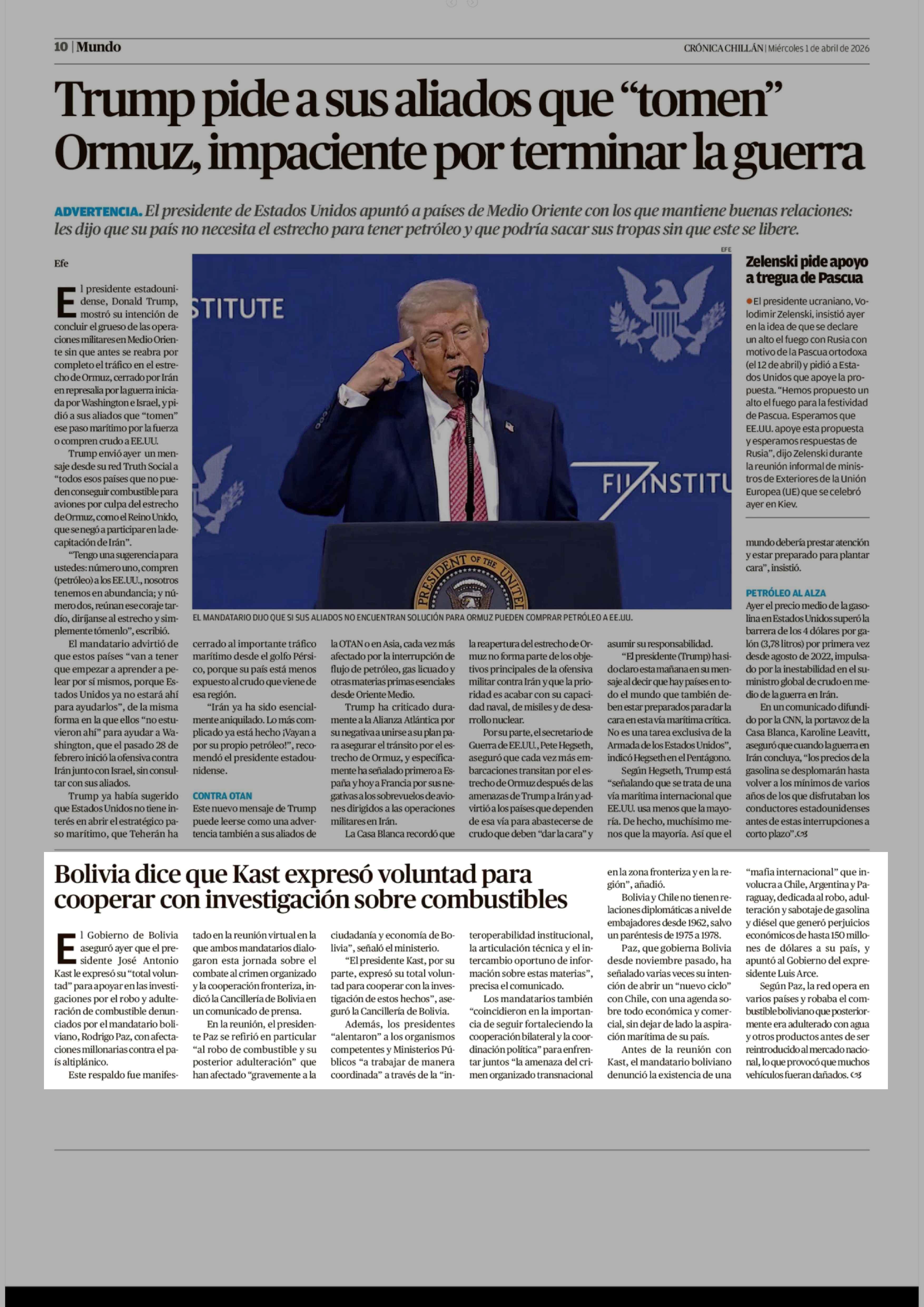 Bolivia dice que Kast expresó voluntad para cooperar con investigación sobre combustibles 01-04-2026 Crónica de Chillán |
