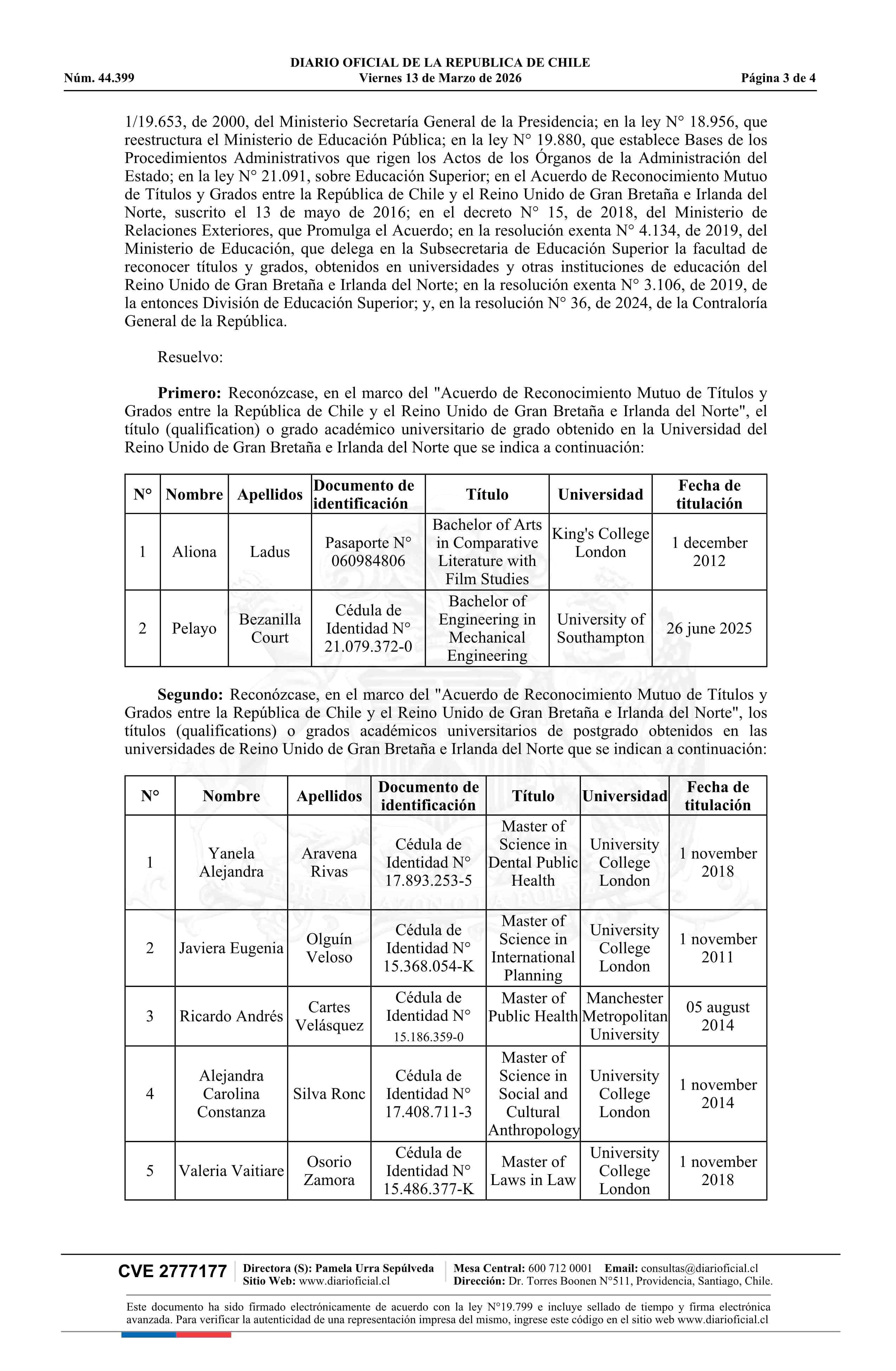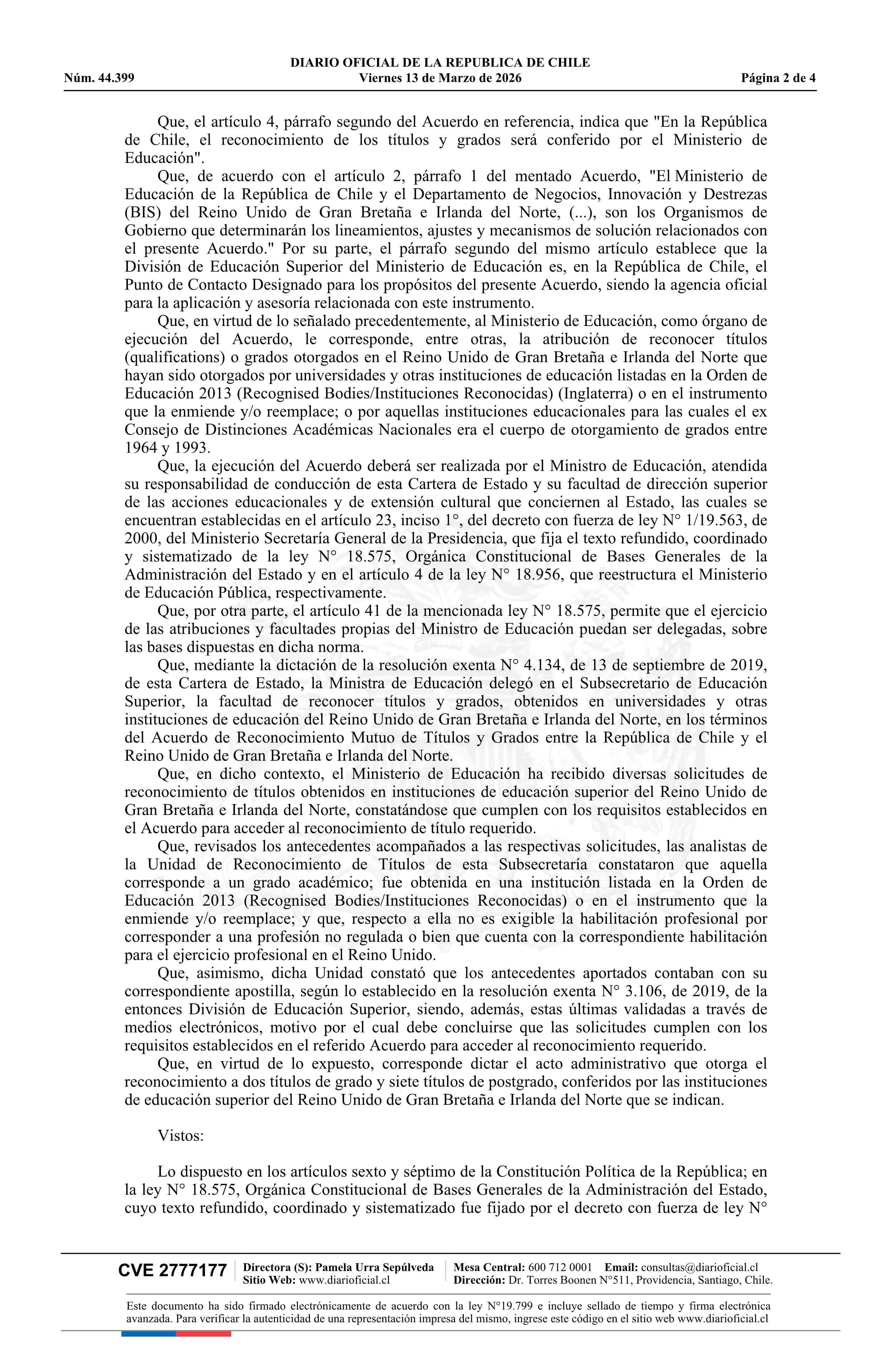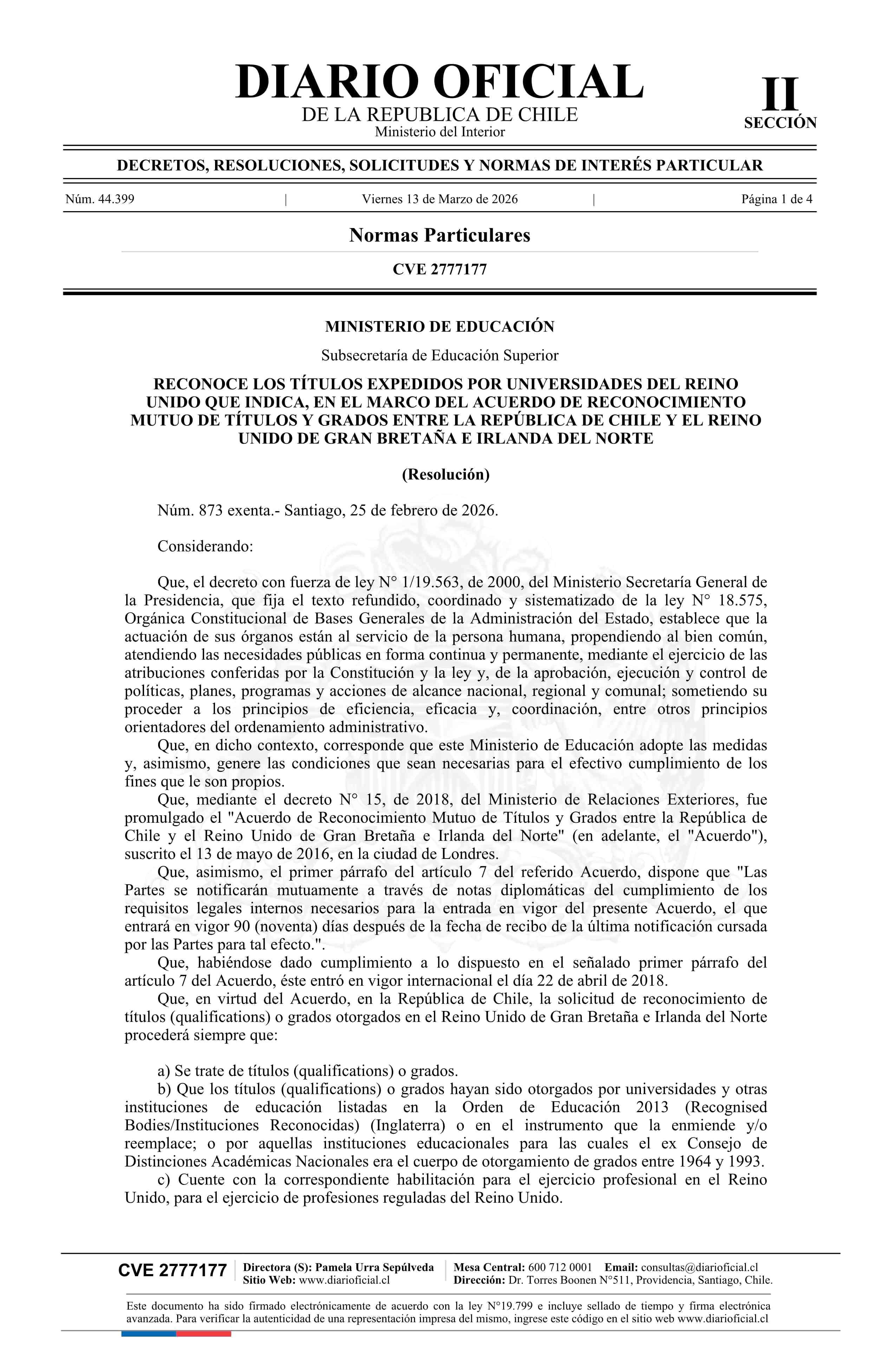 | Título: | Resolución exenta número 873, de 2026.- Reconoce los títulos expedidos por universidades del Reino Unido que indica, en el marco del Acuerdo de Reconocimiento Mutuo de Títulos y Grados entre la República de Chile y el Reino Unido de Gran Bretaña e Irlanda del Norte |